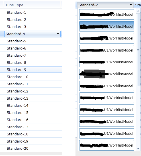 <Style TargetType="telerik:RadComboBox"> <Setter Property="OpenDropDownOnFocus" Value="True"/> <!--<Setter Property="MinHeight" Value="50"/>--> <Setter Property="ItemContainerStyle" Value="{DynamicResource RadComboBoxItemStyle1}" /> <Setter Property="MaxDropDownHeight" Value="500" /> </Style><Style x:Key="RadComboBoxItemStyle1" TargetType="{x:Type telerik:RadComboBoxItem}"> <Setter Property="Background" Value="Transparent" /> <Setter Property="Template"> <Setter.Value> <ControlTemplate TargetType="{x:Type telerik:RadComboBoxItem}"> <Border x:Name="Background" BorderBrush="steelblue" BorderThickness="1" Background="{TemplateBinding Background}" Margin="5,2" CornerRadius="2"> <Grid> <Rectangle x:Name="Highlight" Visibility="Collapsed"> <Rectangle.Fill> <LinearGradientBrush EndPoint="0.5,1" MappingMode="RelativeToBoundingBox" StartPoint="0.5,0"> <GradientStop Color="#FF5F9DD6" /> <GradientStop Color="White" Offset="1" /> </LinearGradientBrush> </Rectangle.Fill> </Rectangle> <ContentPresenter x:Name="Content" ContentTemplate="{TemplateBinding ContentTemplate}" Content="{TemplateBinding Content}" ContentStringFormat="{TemplateBinding ContentStringFormat}" TextElement.Foreground="Black" HorizontalAlignment="{TemplateBinding HorizontalContentAlignment}" VerticalAlignment="{TemplateBinding VerticalContentAlignment}" OpacityMask="Black" Margin="2,10" /> </Grid> </Border> <ControlTemplate.Triggers> <Trigger Property="IsHighlighted" Value="True"> <Setter Property="Visibility" TargetName="Highlight" Value="Visible" /> <Setter Property="BorderBrush" TargetName="Background" Value="SteelBlue" /> <Setter Property="Background" Value="#FF001720" TargetName="Background" /> </Trigger> </ControlTemplate.Triggers> </ControlTemplate> </Setter.Value> </Setter> <Setter Property="HorizontalContentAlignment" Value="Left" /> <Setter Property="VerticalContentAlignment" Value="Center" /> <Setter Property="Padding" Value="3,1" /> <Setter Property="SnapsToDevicePixels" Value="True" /> <Setter Property="FocusVisualStyle" Value="{x:Null}" /> </Style><telerik:GridViewComboBoxColumn DataMemberBinding="{Binding TubeType}" DisplayMemberPath="TubeType" SelectedValueMemberPath="TubeType" Header="Tube Type" MinWidth="200" EditTriggers="CellClick" />