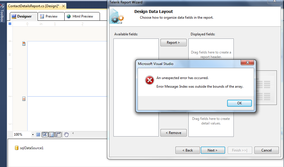 I am using SqlDataSource and data loaded from stored procedure. While designing the report, I am getting this error once the wizard try to populate the result fields. pls check the attachement.