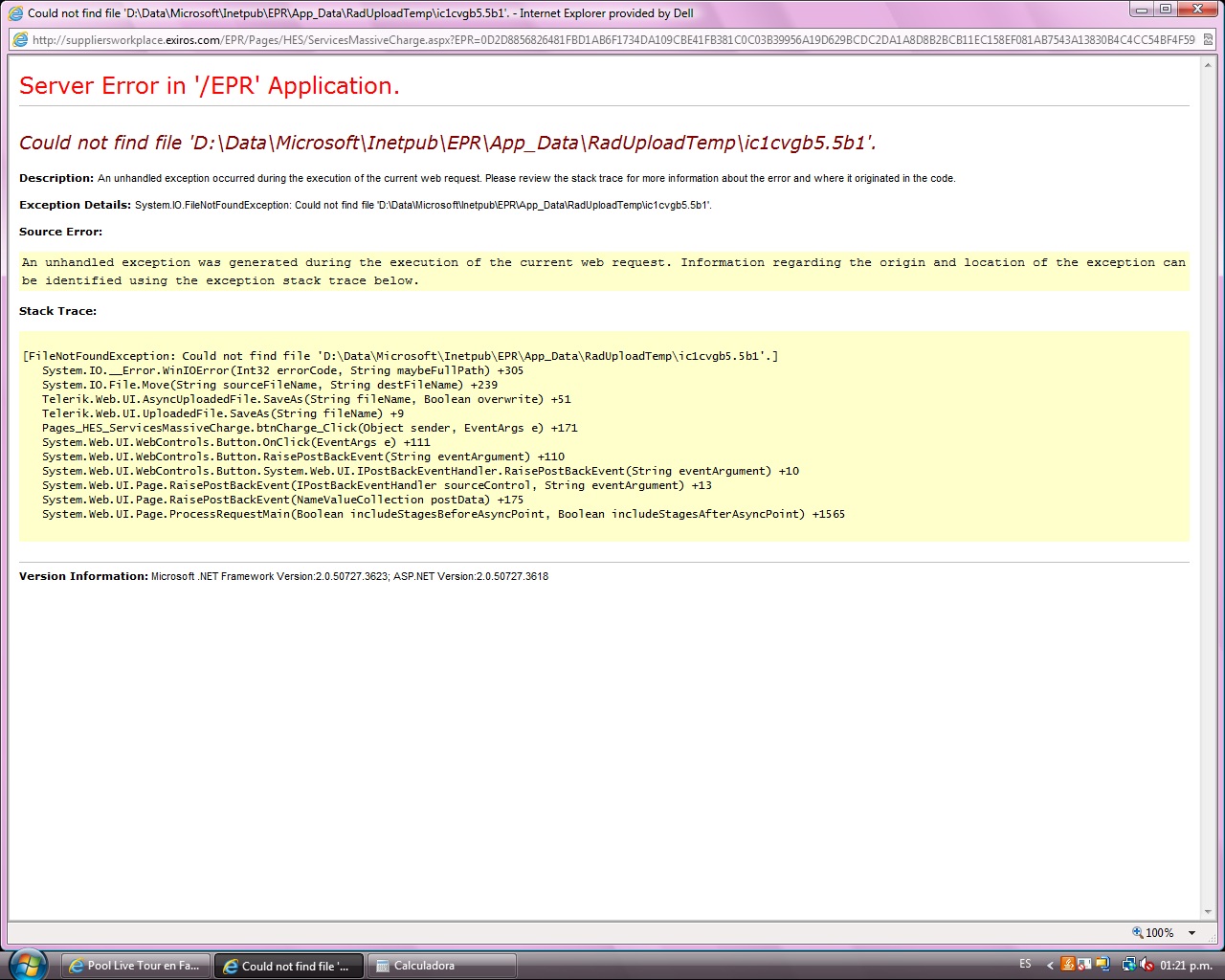 Server Error in '/EPR' Application. -------------------------------------------------------------------------------- Could not find file 'C:\RPG\01-NET\EPR\EPR\EPR\App_Data\RadUploadTemp\nt2njtqp.xhy'. Description: An unhandled exception occurred during the execution of the current web request. Please review the stack trace for more information about the error and where it originated in the code. Exception Details: System.IO.FileNotFoundException: Could not find file 'C:\RPG\01-NET\EPR\EPR\EPR\App_Data\RadUploadTemp\nt2njtqp.xhy'. Source Error: Line 70: Line 71: string fileName = Path.GetTempFileName(); Line 72: uf.SaveAs(fileName); Line 73: Line 74: //DataSet ds = HLPimportExcel.ImportExcel(fileName, Yes); Source File: c:\RPG\01-NET\EPR\EPR\EPR\Pages\HES\ServicesMassiveCharge.aspx.cs Line: 72 Stack Trace: [FileNotFoundException: Could not find file 'C:\RPG\01-NET\EPR\EPR\EPR\App_Data\RadUploadTemp\nt2njtqp.xhy'.] System.IO.__Error.WinIOError(Int32 errorCode, String maybeFullPath) +305 System.IO.File.Move(String sourceFileName, String destFileName) +239 Telerik.Web.UI.AsyncUploadedFile.SaveAs(String fileName, Boolean overwrite) +81 Telerik.Web.UI.UploadedFile.SaveAs(String fileName) +38 Pages_HES_ServicesMassiveCharge.btnCharge_Click(Object sender, EventArgs e) in c:\RPG\01-NET\EPR\EPR\EPR\Pages\HES\ServicesMassiveCharge.aspx.cs:72 System.Web.UI.WebControls.Button.OnClick(EventArgs e) +111 System.Web.UI.WebControls.Button.RaisePostBackEvent(String eventArgument) +110 System.Web.UI.WebControls.Button.System.Web.UI.IPostBackEventHandler.RaisePostBackEvent(String eventArgument) +10 System.Web.UI.Page.RaisePostBackEvent(IPostBackEventHandler sourceControl, String eventArgument) +13 System.Web.UI.Page.RaisePostBackEvent(NameValueCollection postData) +36 System.Web.UI.Page.ProcessRequestMain(Boolean includeStagesBeforeAsyncPoint, Boolean includeStagesAfterAsyncPoint) +1565 -------------------------------------------------------------------------------- Version Information: Microsoft .NET Framework Version:2.0.50727.5448; ASP.NET Version:2.0.50727.5420I solve the problem with those double-click-on-buttons users with javasript, disabling the button and forcing a postback