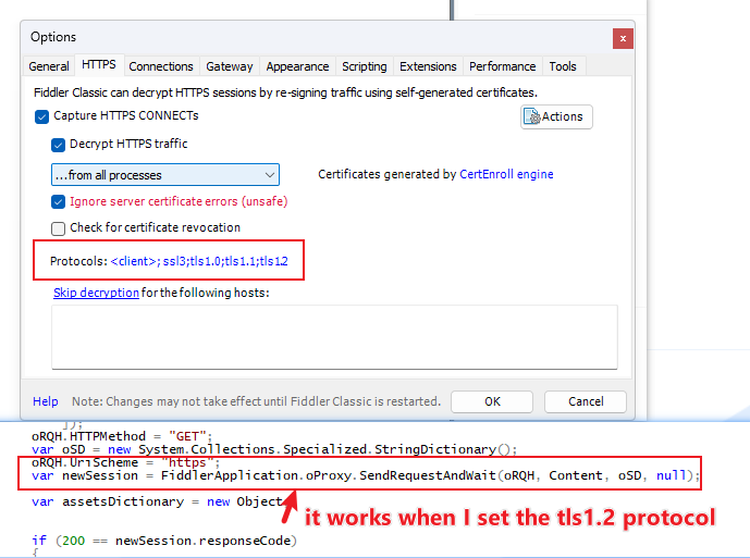 I've written a fiddle script to send another request to get the necessary info to proxy the original request via FidderClassic. It works fine with the tls1.2 protocol. But when I try to use FiddlerCore to do the same thing, I got the 502 error again(the error occured when I use FiddlerClassic without tls1.2 protocol).