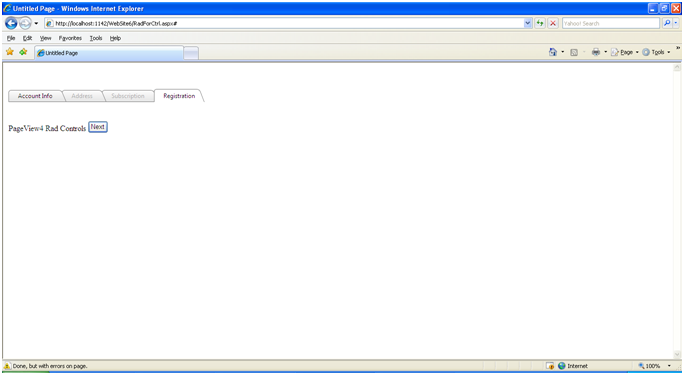 <%@ Page Language="C#" AutoEventWireup="true" CodeFile="RadForCtrl.aspx.cs" Inherits="RadForCtrl" %><%@ Register Assembly="System.Web.Extensions, Version=1.0.61025.0, Culture=neutral, PublicKeyToken=31bf3856ad364e35" Namespace="System.Web.UI" TagPrefix="asp" %><%@ Register Assembly="Telerik.Web.UI" Namespace="Telerik.Web.UI" TagPrefix="telerik" %><!DOCTYPE html PUBLIC "-//W3C//DTD XHTML 1.0 Transitional//EN" "http://www.w3.org/TR/xhtml1/DTD/xhtml1-transitional.dtd"><html xmlns="http://www.w3.org/1999/xhtml" ><head runat="server"> <title>Untitled Page</title> </head><body> <form id="form1" runat="server"> <asp:ScriptManager ID="ScriptManager1" runat="server"> </asp:ScriptManager> <div> <telerik:RadTabStrip ID="RadTabStrip1" runat="server" MultiPageID="RadMultiPage1" SelectedIndex="2"> <Tabs> <telerik:RadTab runat="server" PageViewID="PageView0" SelectedIndex="0" Text="Account Info"></telerik:RadTab> <telerik:RadTab runat="server" Enabled="False" PageViewID="PageView1" Text="Address"></telerik:RadTab> <telerik:RadTab runat="server" Enabled="False" PageViewID="PageView2" Text="Subscription"></telerik:RadTab> <telerik:RadTab runat="server" Enabled="False" PageViewID="PageView3" Text="Registration"></telerik:RadTab> </Tabs> </telerik:RadTabStrip> </div> <telerik:RadMultiPage ID="RadMultiPage1" runat="server" SelectedIndex="2"> <telerik:RadPageView ID="PageView0" runat="server"> <asp:Label ID="Label1" runat="server" Text="Title"></asp:Label> <asp:DropDownList ID="DropDownList1" runat="server"> <asp:ListItem>Mr.</asp:ListItem> <asp:ListItem>Mrs.</asp:ListItem> <asp:ListItem>Miss.</asp:ListItem> </asp:DropDownList><br /> <asp:Label ID="Label5" runat="server" Text="First Name"></asp:Label> <asp:TextBox ID="txtFirstName" runat="server"></asp:TextBox> <asp:RequiredFieldValidator ID="RequiredFieldValidator1" runat="server" ControlToValidate="txtFirstName" ErrorMessage="Frist Name is Required" Display="Dynamic"></asp:RequiredFieldValidator><br /> <asp:Label ID="Label6" runat="server" Text="Second Name"></asp:Label> <asp:TextBox ID="txtSecondName" runat="server"></asp:TextBox><br /> <asp:Label ID="Label7" runat="server" Text="E-Mail"></asp:Label> <asp:TextBox ID="txtMail" runat="server"></asp:TextBox><br /> <asp:Button ID="buttonNextAccount" runat="server" OnClick="buttonNextAccount_Click" Text="Next" /></telerik:RadPageView> <telerik:RadPageView ID="PageView1" runat="server"> PageView2 <asp:Label ID="Label2" runat="server" Text="Hello"></asp:Label> <asp:Button ID="buttonNextAddress" runat="server" OnClick="buttonNextAddress_Click" Text="Next" /></telerik:RadPageView> <telerik:RadPageView ID="PageView2" runat="server"> PageView3 <asp:Label ID="Label3" runat="server" Text="Welcome"></asp:Label><asp:Button ID="buttonNextSubscribe" runat="server" OnClick="buttonNextSubscribe_Click" Text="Next" /></telerik:RadPageView> <telerik:RadPageView ID="PageView3" runat="server"> PageView4 <asp:Label ID="Label4" runat="server" Text="Rad Controls"></asp:Label> <asp:Button ID="buttonNextReg" runat="server" OnClick="buttonNextReg_Click" Text="Next" /></telerik:RadPageView> </telerik:RadMultiPage> </form></body></html>