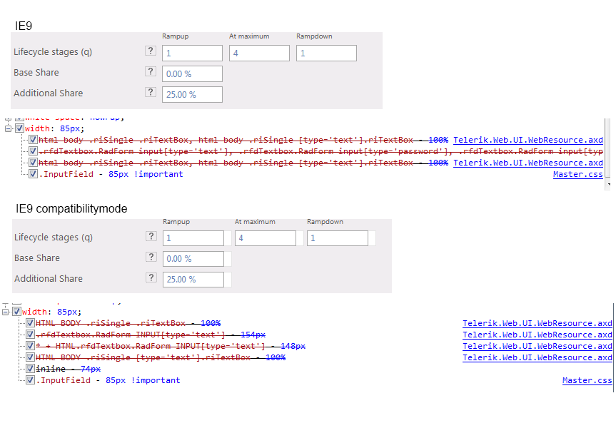 .riDisplay{ border-width: 1px !important; color: #6384B5 !important; border-color: #A8A8A8 !important; *height: auto !important;}.InputField{ width: 85px !important;}When I display this in IE9 (or Chrome, FireFox) this will be displayed correct.