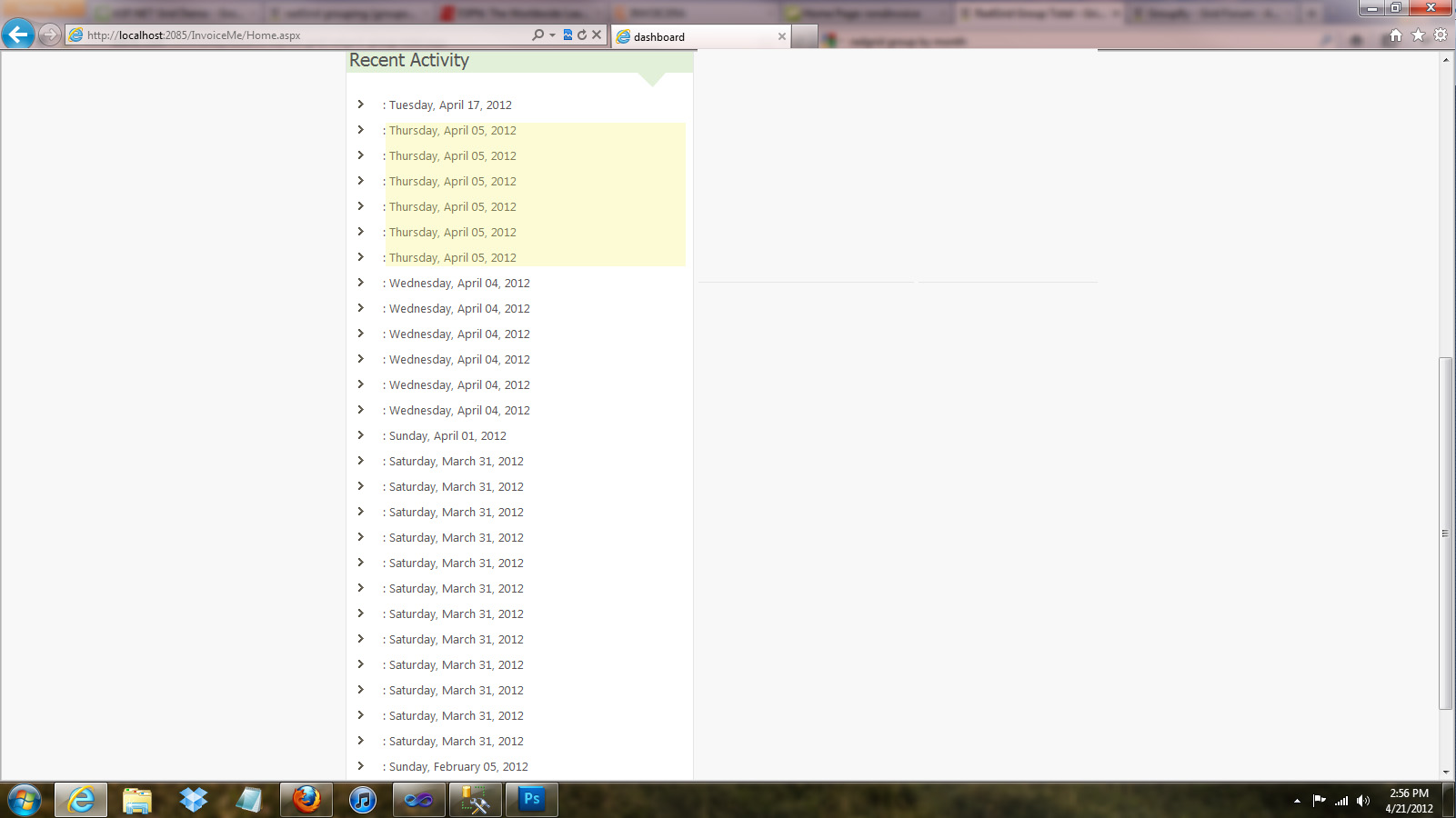 I'm experiencing an issue with radgrid grouping. Apparently the grid is only sorting by date but not grouping by date. For example; If I had 5 entries for 4/20/2012 I would expect a group for the date and five sub entries. But what I'm experiencing is 5 separate groups. I attached a screenshot to give you an idea. I really appreciate your help.