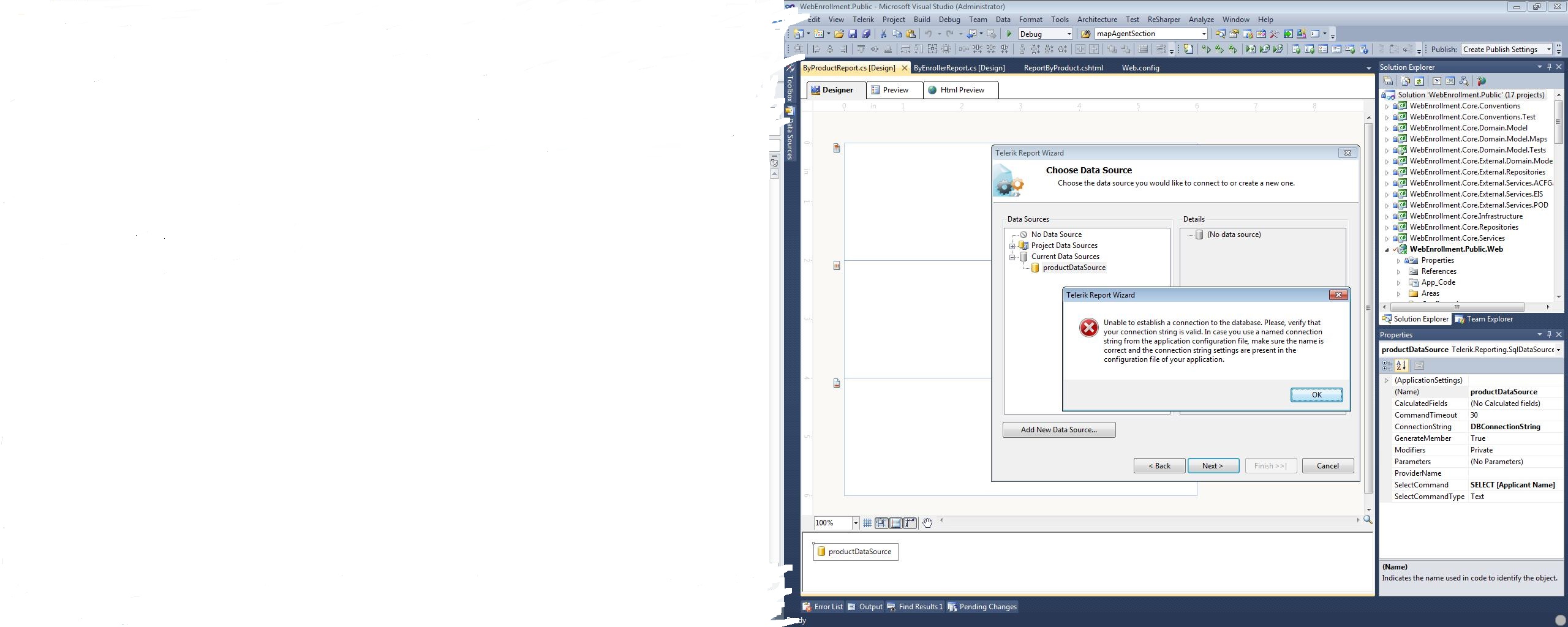 Also i created a connection string with the same name as that in web.config file. but i get the error shown in attached file when i try to add fields onto report.