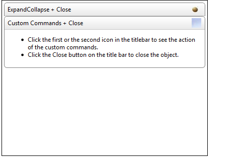 <telerik:RadDockZone runat="server" ID="RadDockZone1" Width="400" > <telerik:RadDock runat="server" ID="RadDock2" Title="ExpandCollapse" EnableRoundedCorners="true" DefaultCommands="ExpandCollapse"> <ContentTemplate> ........................... </ContentTemplate> </telerik:RadDock> <telerik:RadDock runat="server" ID="RadDock3" Title="Custom Commands" DefaultCommands="ExpandCollapse" EnableRoundedCorners="true"> <ContentTemplate> ........................... </ContentTemplate> </telerik:RadDock></telerik:RadDockZone>CSS: