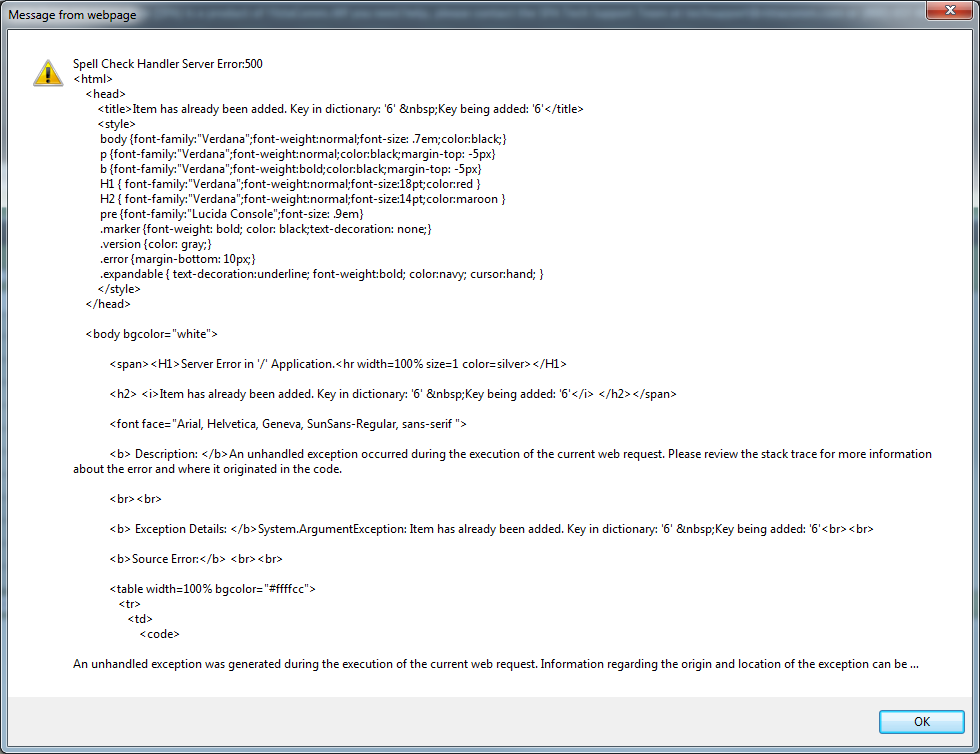 This error usually indicates a corrupt dictionary file. Please check your spell dictionaries (*.tdf files) and make sure that they are the same as the originals from the RadEditor installation. If you have tried to make modifications to some of the tdf dictionary files, you can tell us what you wanted to change and we will tell you how to do it.