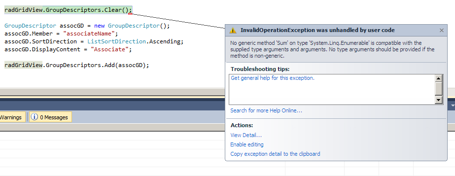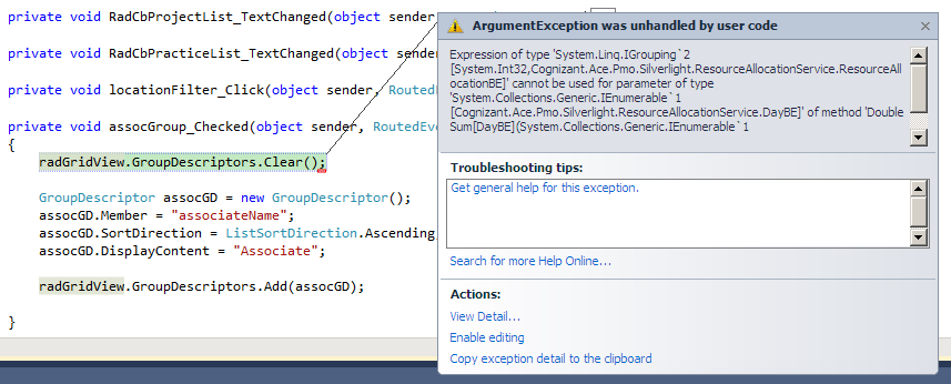 foreach (DayBE _dayBE in _days.OrderBy(x => x.date).ToList()) { string headerText = _dayBE.date.ToString("dd-MMM"); GridViewDataColumn gvdc = new GridViewDataColumn() { IsReadOnly=false, Header = headerText, DataMemberBinding = new Binding("period") { Converter = new GridFormatter(), ConverterParameter = new List<object>() { _dayBE.date } } }; //AggregateFunction sum = new MaxFunction(); //sum.Caption = "Total: "; //gvdc.AggregateFunctions.Add(fn); radGridView.Columns.Add(gvdc); }public class GridFormatter : IValueConverter { public object Convert(object value, Type targetType, object parameter, CultureInfo culture) { ObservableCollection<DayBE> weeks = value as ObservableCollection<DayBE>; var val = from w in weeks where w.date.Equals((parameter as List<object>)[0]) select w.allocation; return val.FirstOrDefault(); } public object ConvertBack(object value, Type targetType, object parameter, CultureInfo culture) { ObservableCollection<DayBE> _test1 = new ObservableCollection<DayBE>(); DayBE _test = new DayBE(); _test.date = System.Convert.ToDateTime((parameter as List<object>)[0].ToString()); _test.allocation = System.Convert.ToDouble(value); _test1.Add(_test); return _test1; } }