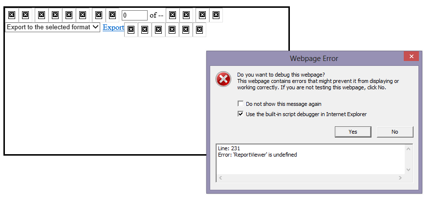 I have created a report in the standalone designer and it previews just fine. When I try to display the report on an ..aspx web page in a Visual Studio 2012 web application, I receive errors on every item on the report viewer (all buttons and the ReportViewer itself).