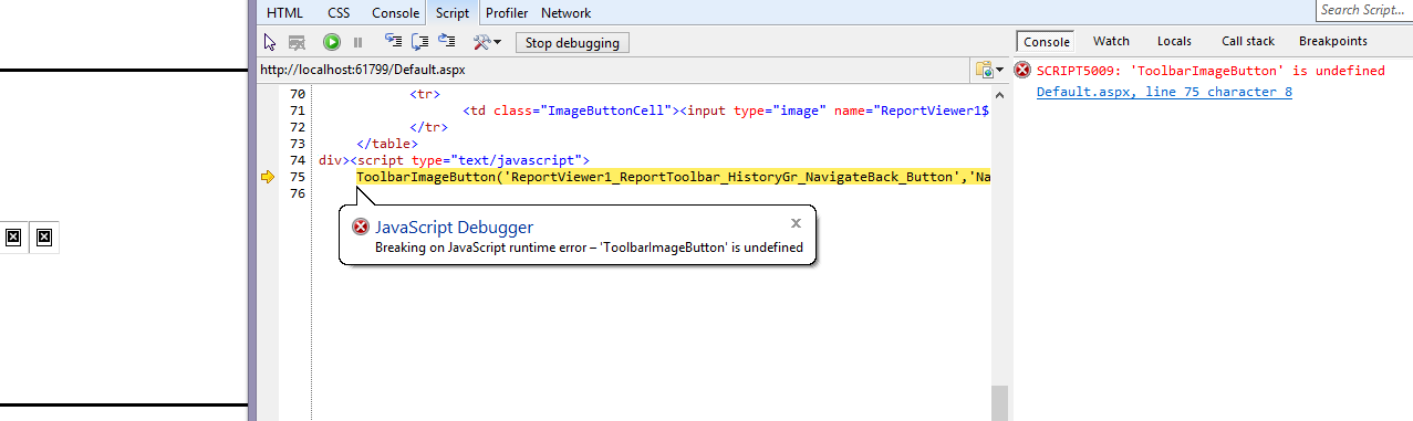 I have attached a screen capture of the displayed page + the error dialog box (DisplayedPage1.png). I have also attached a screen capture of the actual javascript error line (DisplayedPage2.png), and a screen capture of the Visual Studio project including the .aspx html page. There is no code at all in the code-behind file. I have also attached the Fiddler screen capture which shows that nothing related to the Report Viewer is found when the page is displayed.