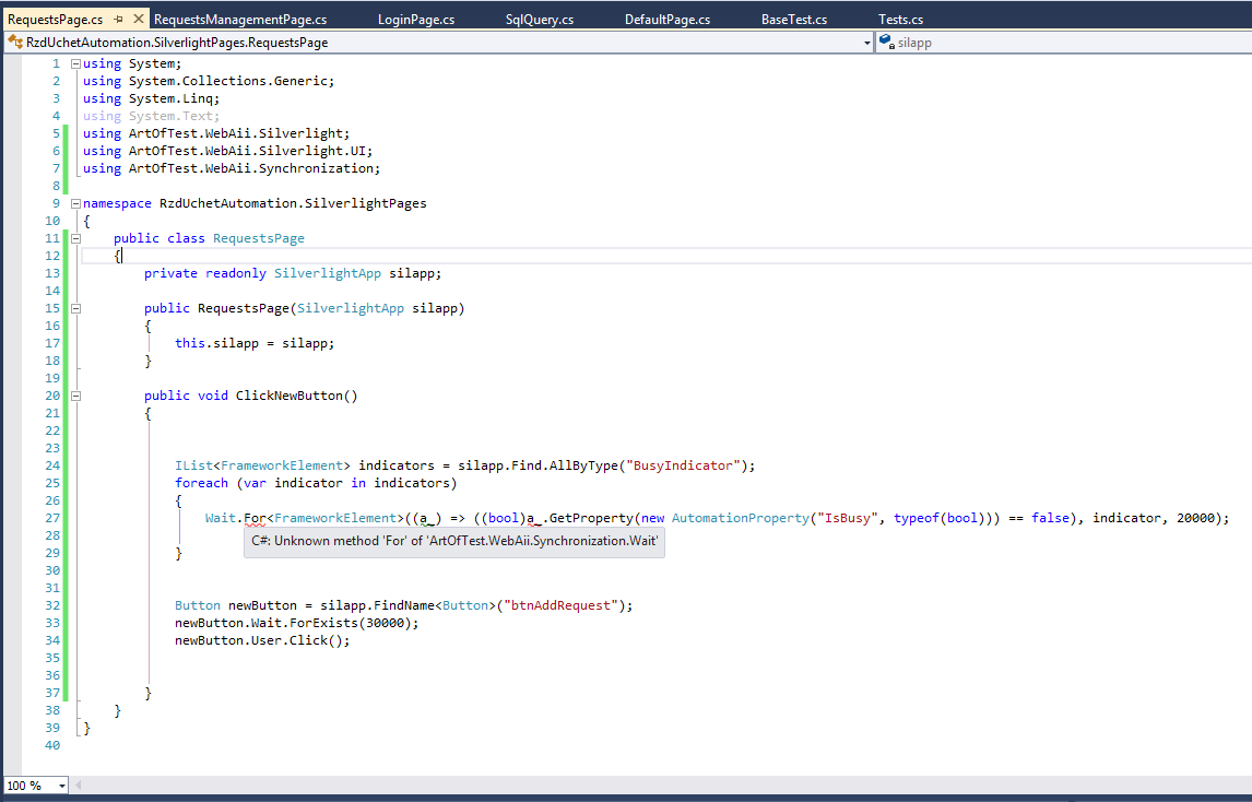 I've got error on VS. When I type "Wait.For", VS displays an error "Unknown method "For" of ArtOfTest.WebAii.Synchronization.Wait".