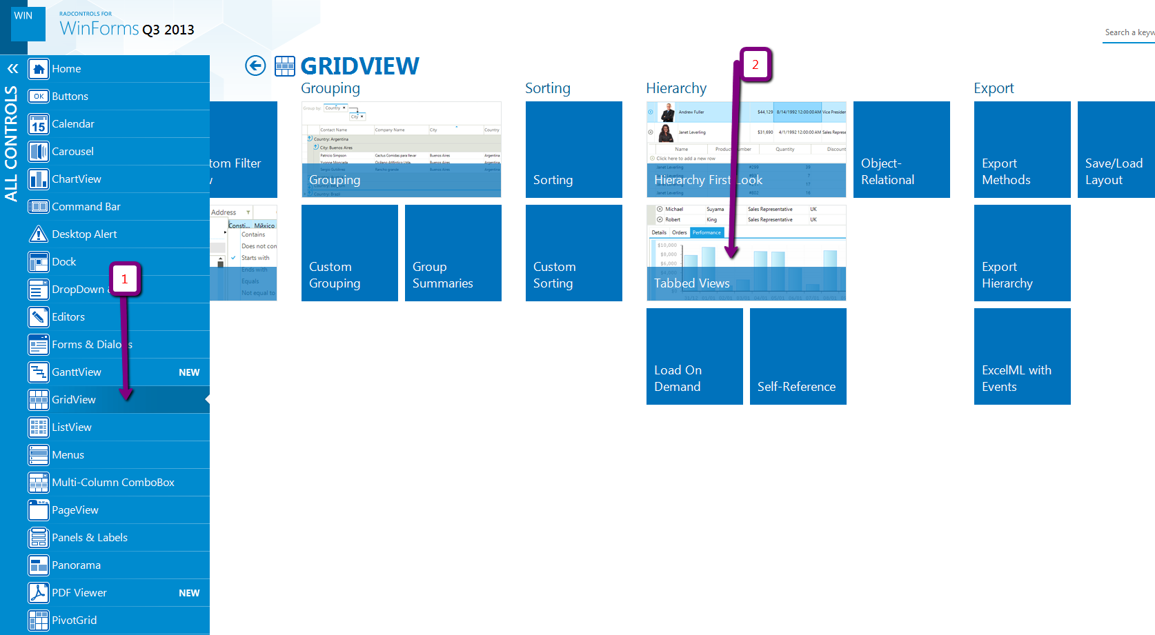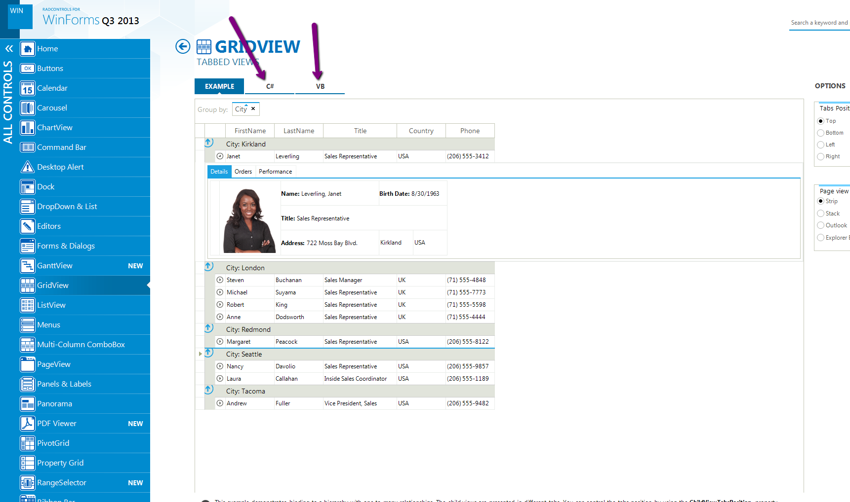 The demo from the picture is available in our demo application (Demo Application - RadControls for WinForms Q3 2013). Just open the demo application go to grid section and click Tabbed Views (see first attached image).