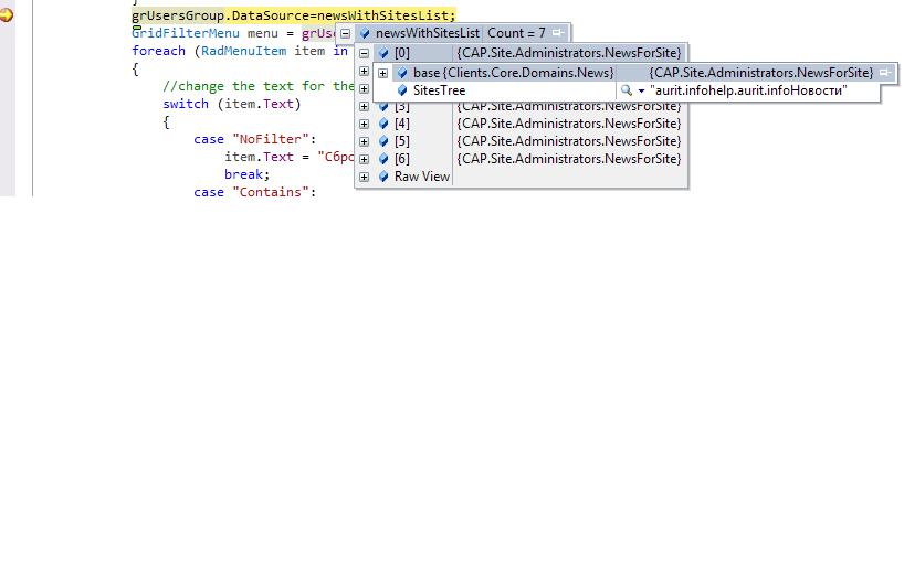 In debugger (you can see it at attached picture) I can see that all of paramerts of NewsForSite are in base collection and SitesTree parametr is outstanding, and when I try to bind this parametr to grid like other parmetrs, there is an empty space instead of SitesTree stings in grid. Otner columns look well.