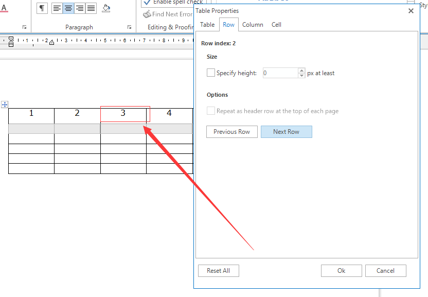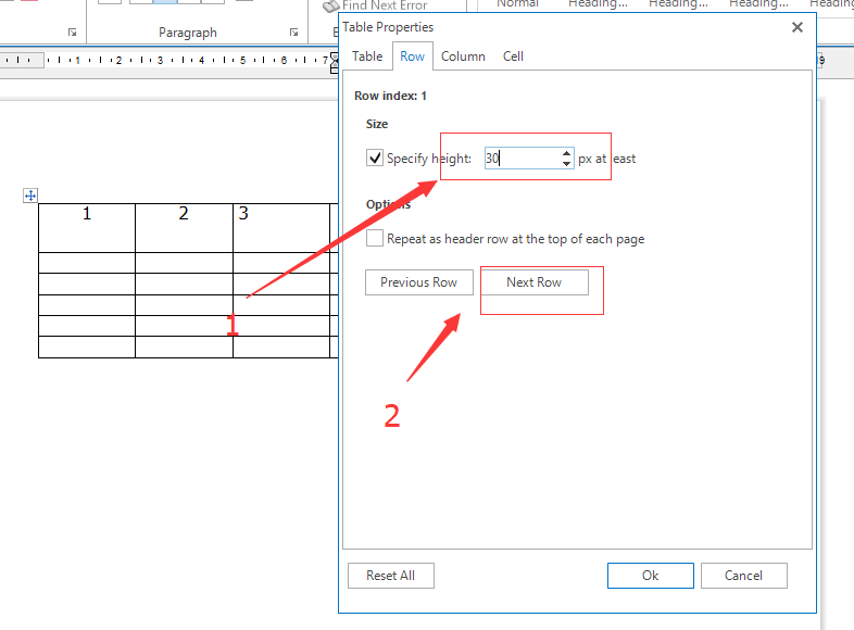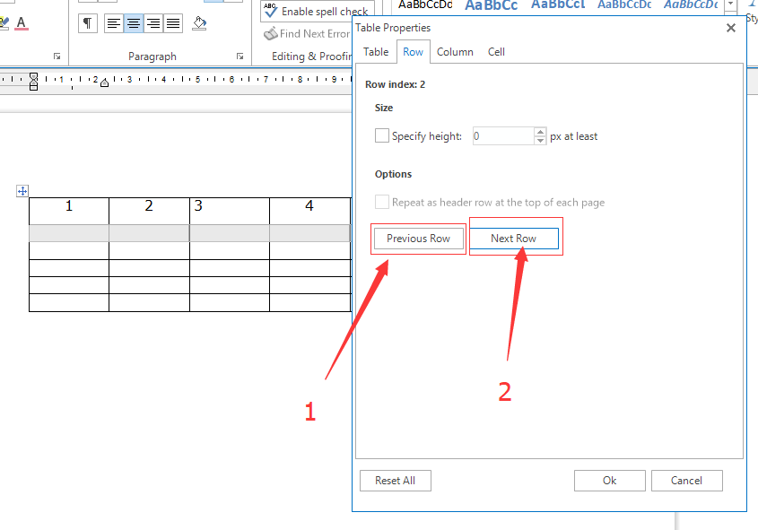 The desired behavior with the Table Properties dialog would be to change the height of the current row. The previous and next buttons allow the respective rows to be selected and if necessary their height be updated as well. I am attaching a short video showing the result on my end.
