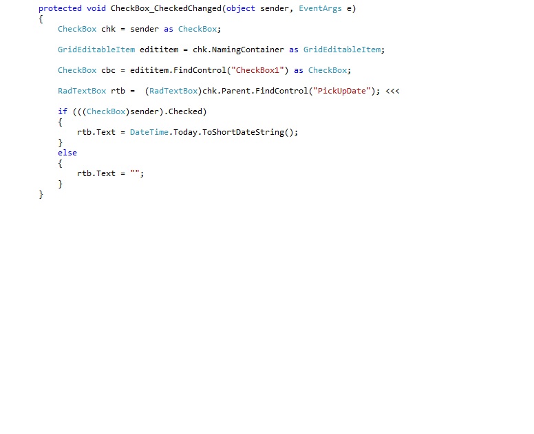 I have a RadGrid that contains two cell's, one a gridboundcolumn and the other is an itemtemplate ( Check Box ). When the checkbox is unChecked (CheckBoxChanged) I need to clear the contents of the GridBounfColumn, but am not having much luck.
