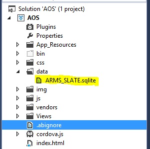 In the above code I can create the ARMS_SLATE.sqlite db and access the same. But I want to access the DB which is placed under the data folder. Please refer in the attached image.