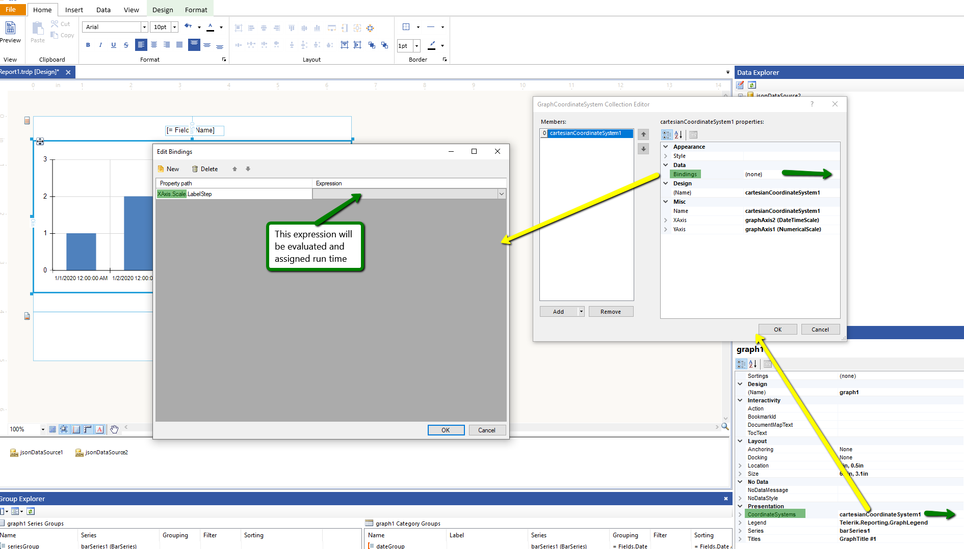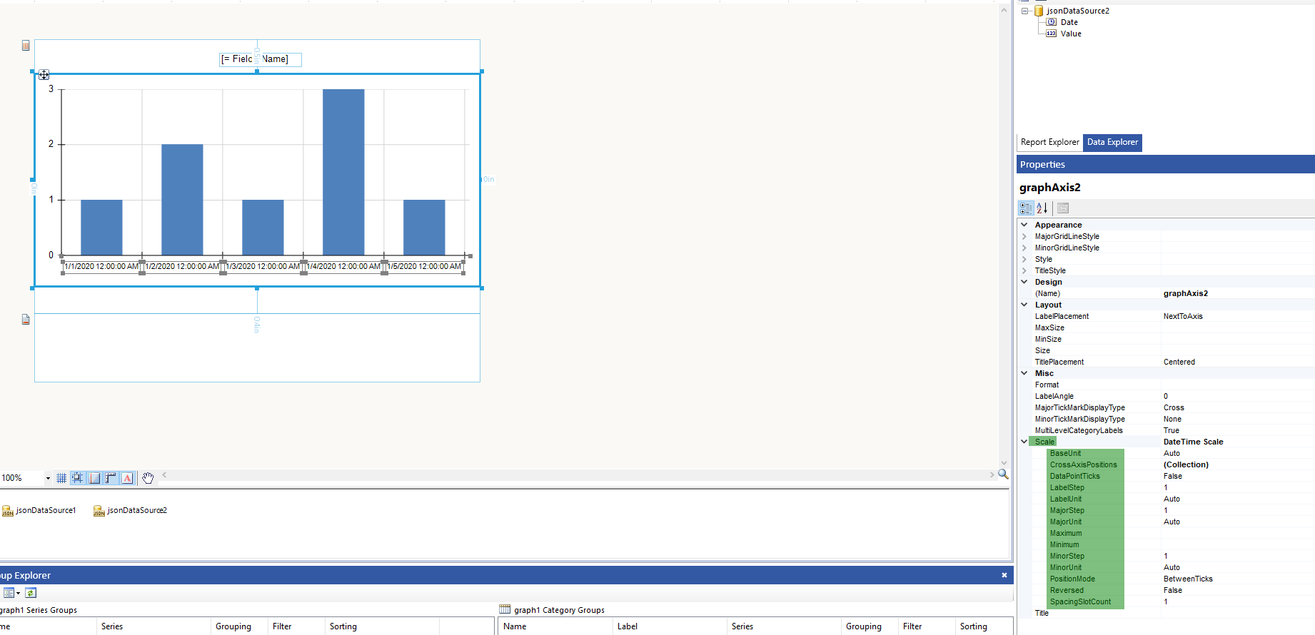 I have the following problem. I have a report that contains a few graphs with X axis as DateTime and a subreport which is also a graph reused in many reports. It is not acceptable to me to set label, major and minor points units and ranges in designer since in one case I can have 7 days process, and in other case 5 minutes process. According to this I need to calculate total time and decide if I will set label, major and minor points in seconds, minutes or hours, and also to calculate range so that I have approximately 10 major points on the graphs X axes. To achieve this i am modifying values set in designer programmatically at runtime. I tried the following approaches, neither is working:
