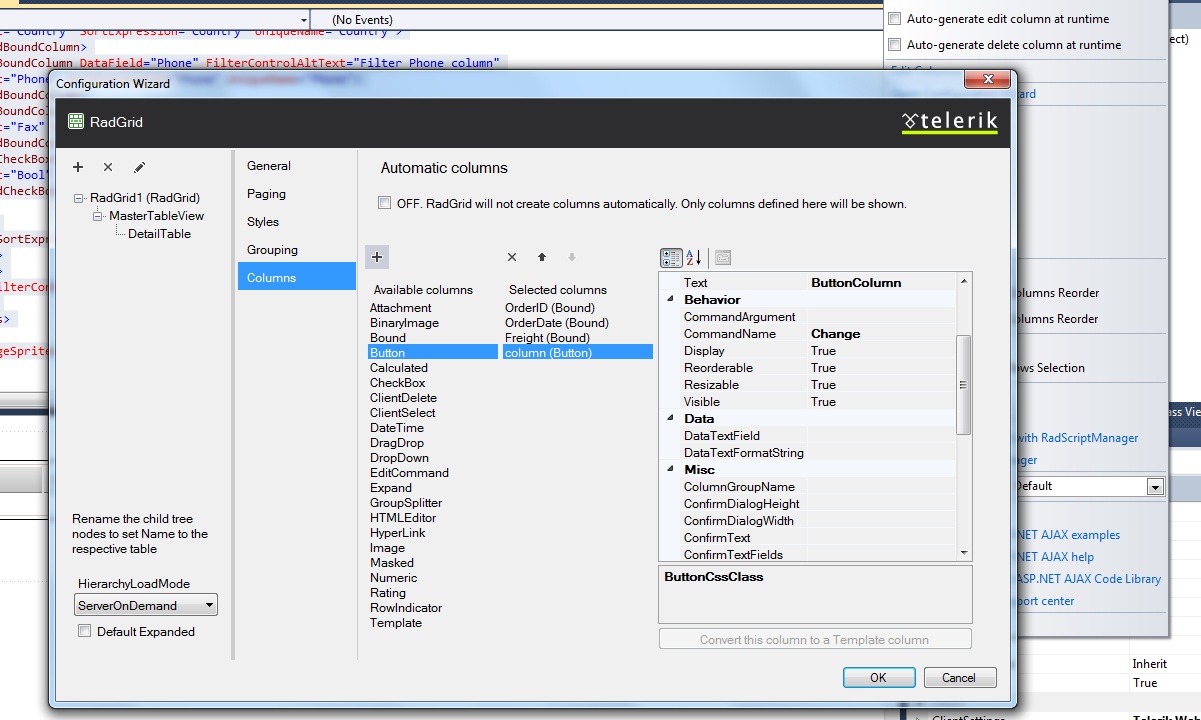 I can add a button to the parent using the configuration wizard. So when I bind the dataset to the grid, the button shows together with the parent datatable columns defined in the server.