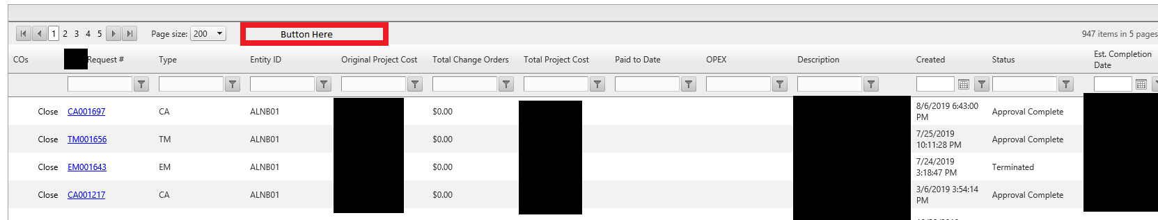In my picture I show my example of what I am wanting. I want a button to appear in the header portion of the RadGrid next to Page Size.