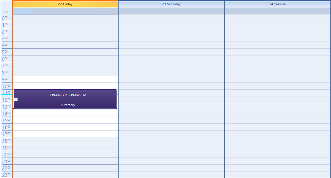 You are not receiving mouse notifications because the mouse is handled by the inner elements that were added to the custom appointment element. Whether an element handles the mouse or notifies its parent for any mouse messages is controlled by the ShouldHandleMouseInput and NotifyParentOnMouseInput properties. I also understand that you would like to have the time and description parts aligned to the left. This can be accomplished by setting the TextAlignment property of the two LightVisualElements. You can initialize the custom elements this way: