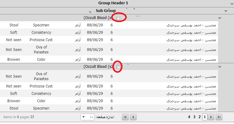 <GroupHeaderTemplate> <asp:Label runat="server" ID="Label5" Text='<%# (((GridGroupHeaderItem)Container).AggregatesValues["name"]) + "" + (((GridGroupHeaderItem)Container).AggregatesValues["Sname"]) +""+ (((GridGroupHeaderItem)Container).AggregatesValues["nametest"])%>'> </asp:Label> <asp:CheckBox ID="IsOkCheckBox" runat="server" Text="Hi" /> </GroupHeaderTemplate>I think to solve this problem I should hide other checkboxes: