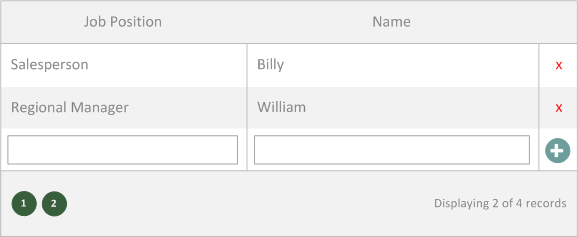<div id="example" class="k-content"> <table id="grid"> <colgroup> <col class="photo" /> <col class="details" /> <col /> </colgroup> <thead> <tr> <th> Picture </th> <th> Details </th> <th> ID </th> </tr> </thead> <tbody> <tr> <td colspan="3"></td> </tr> </tbody> <tfoot> <tr> <td> <input type="text"> </td> <td> <input type="text"> </td> <td> <input type="button" value="Add" /> </td> </tr> </tfoot> </table> <div id="pager"></div> <script id="rowTemplate" type="text/x-kendo-tmpl"> <tr data-uid="#: id #"> <td class="photo"> <span class="title">#: productName #</span> </td> <td class="details"> <span class="title">#: category #</span> </td> <td class="employeeID"> <a class="k-button k-button-icontext" href="\#" onclick="deleteValue(this)"><span class="k-icon k-delete"></span></a> </td> </tr> </script> <script id="altRowTemplate" type="text/x-kendo-tmpl"> <tr class="k-alt" data-uid="#: id #"> <td class="photo"> <span class="title">#: productName #</span> </td> <td class="details"> <span class="title">#: category #</span> </td> <td class="employeeID"> <a class="k-button k-button-icontext" href="\#" onclick="deleteValue(this)"><span class="k-icon k-delete"></span></a> </td> </tr> </script></div>Here is my script code: