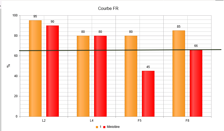 <telerik:RadHtmlChart runat="server" ChartTitle-Text="Courbe FR" ID="RadHtmlChart1" Width="800" Height="500"> <PlotArea> <Series> <telerik:ColumnSeries Name="District"> <TooltipsAppearance Color="White" /> <SeriesItems> <telerik:CategorySeriesItem Y="95" /> <telerik:CategorySeriesItem Y="80" /> <telerik:CategorySeriesItem Y="80" /> <telerik:CategorySeriesItem Y="85" /> </SeriesItems> </telerik:ColumnSeries> <telerik:ColumnSeries AxisName="AdditionalAxis" Name="Ministère"> <Appearance> <FillStyle BackgroundColor="Red" /> </Appearance> <TooltipsAppearance Color="White" /> <SeriesItems> <telerik:CategorySeriesItem Y="90" /> <telerik:CategorySeriesItem Y="80" /> <telerik:CategorySeriesItem Y="45" /> <telerik:CategorySeriesItem Y="66" /> </SeriesItems> </telerik:ColumnSeries> </Series> <YAxis MinValue="0"> <TitleAppearance Text="%" /> </YAxis> <AdditionalYAxes> <telerik:AxisY Name="AdditionalAxis" Visible="false" Color="Red" Width="3"> <TitleAppearance Text="%" Visible="false" /> </telerik:AxisY> </AdditionalYAxes> <Series> <telerik:BarSeries Name="Seuil"> <Appearance> <FillStyle BackgroundColor="Red"></FillStyle> </Appearance> <LabelsAppearance Position="Center"> </LabelsAppearance> <TooltipsAppearance BackgroundColor="Red"></TooltipsAppearance> <SeriesItems> <telerik:CategorySeriesItem Y="55"></telerik:CategorySeriesItem> </SeriesItems> </telerik:BarSeries> </Series> <XAxis> <LabelsAppearance /> <Items> <telerik:AxisItem LabelText="L2" /> <telerik:AxisItem LabelText="L4" /> <telerik:AxisItem LabelText="F5" /> <telerik:AxisItem LabelText="F8" /> </Items> </XAxis> </PlotArea> <Legend> <Appearance Position="Bottom" /> </Legend> </telerik:RadHtmlChart>