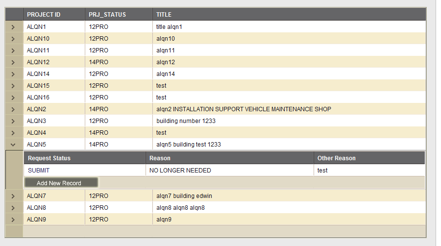 <telerik:RadGrid ID="RadGrid1" runat="server" DataSourceID="SqlDataSource1" AutoGenerateColumns="false" > <MasterTableView DataSourceID="SqlDataSource1" DataKeyNames="ProjectID" HierarchyDefaultExpanded="true"> <DetailTables> <telerik:GridTableView DataSourceID="SqlDataSource2" DataKeyNames="RequestStatus" runat="server" ShowFooter="true" Name="DetailTable1"> <ParentTableRelation> <telerik:GridRelationFields DetailKeyField="CustomerID" MasterKeyField="ProjectID" /> </ParentTableRelation> <Columns> <telerik:GridBoundColumn UniqueName="RequestStatus" HeaderText="Request Status" DataField="RequestStatus" ></telerik:GridBoundColumn> <telerik:GridBoundColumn UniqueName="Reason" HeaderText="Reason" DataField="Reason" ></telerik:GridBoundColumn> <telerik:GridBoundColumn UniqueName="Other Reason" HeaderText="Other Reason" DataField="Other Reason" ></telerik:GridBoundColumn> <telerik:GridTemplateColumn > <FooterTemplate> <asp:Button ID="Button1" runat="server" Text="Add New Record" /> </FooterTemplate> </telerik:GridTemplateColumn> </Columns> </telerik:GridTableView> </DetailTables> <Columns> <telerik:GridBoundColumn UniqueName="ProjectID" HeaderText="Project ID" DataField="ProjectID"></telerik:GridBoundColumn> <telerik:GridBoundColumn UniqueName="prj_status" HeaderText="prj_status" DataField="prj_status"></telerik:GridBoundColumn> <telerik:GridBoundColumn UniqueName="Title" HeaderText="Title" DataField="Title"></telerik:GridBoundColumn> </Columns> </MasterTableView></telerik:RadGrid><style type="text/css"> .RadGrid_Default .rgFooter td { float:left !important; }</style>Thanks,