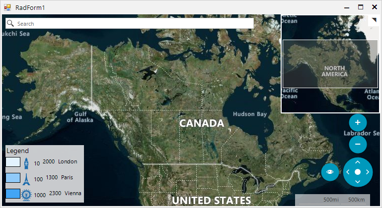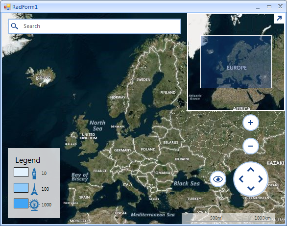 public RadForm1(){ InitializeComponent(); new RadControlSpyForm().Show(); string cacheFolder = @"..\..\cache"; BingRestMapProvider bingProvider = new Telerik.WinControls.UI.BingRestMapProvider(); bingProvider.UseSession = true; bingProvider.BingKey = bingKey; LocalFileCacheProvider cache = new LocalFileCacheProvider(cacheFolder); bingProvider.CacheProvider = cache; this.radMap1.Providers.Add(bingProvider); this.radMap1.ShowLegend = true; this.radMap1.MapElement.LegendElement.TitleElement.Text = "Legend"; MapLegendItemElement legendElement = new MapLegendItemElement("10", Color.FromArgb(227, 242, 253)); legendElement.TextElement.Image = Properties.Resources.blue_london; legendElement.TextElement.DrawImage = true; legendElement.TextElement.TextImageRelation = TextImageRelation.ImageBeforeText; this.radMap1.MapElement.LegendElement.ItemStackElement.Children.Add(legendElement); legendElement = new MapLegendItemElement("100", Color.FromArgb(144, 202, 249)); legendElement.TextElement.Image = Properties.Resources.blue_paris; legendElement.TextElement.DrawImage = true; legendElement.TextElement.TextImageRelation = TextImageRelation.ImageBeforeText; this.radMap1.MapElement.LegendElement.ItemStackElement.Children.Add(legendElement); legendElement = new MapLegendItemElement("1000", Color.FromArgb(66, 165, 245)); legendElement.TextElement.Image = Properties.Resources.blue_vienna; legendElement.TextElement.DrawImage = true; legendElement.TextElement.TextImageRelation = TextImageRelation.ImageBeforeText; this.radMap1.MapElement.LegendElement.ItemStackElement.Children.Add(legendElement); }Note that most of the forum threads are reviewed by Telerik representatives and sometimes we address the questions asked by our customers in the forums as well. However, a post in the forum doesn't guarantee you a response from the Telerik support team. Moreover, threads are handled according to license and time of posting, so if it is an urgent problem, we suggest you use a support ticket, which would be handled before a forum thread. Thank you for your understanding.