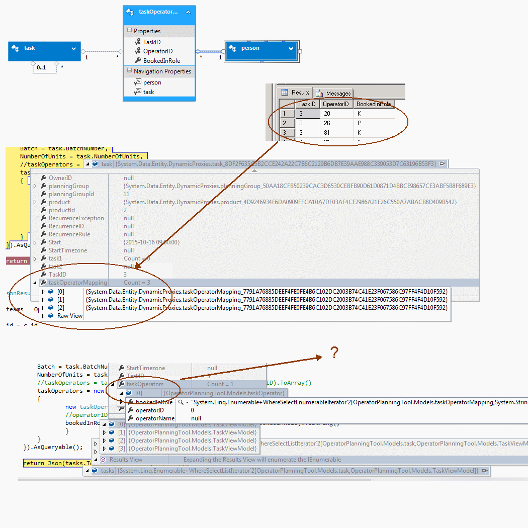 public class TaskViewModel : ISchedulerEvent{ public int TaskID { get; set; } public string Title { get; set; } ... public virtual List<taskOperator> taskOperators { get; set; }}public class taskOperator{ public int TaskID {get; set;} public int operatorID { get; set; } public string operatorName { get; set; } public string bookedInRole { get; set; } public TaskViewModel task { get; set; }}TasksRead Action: