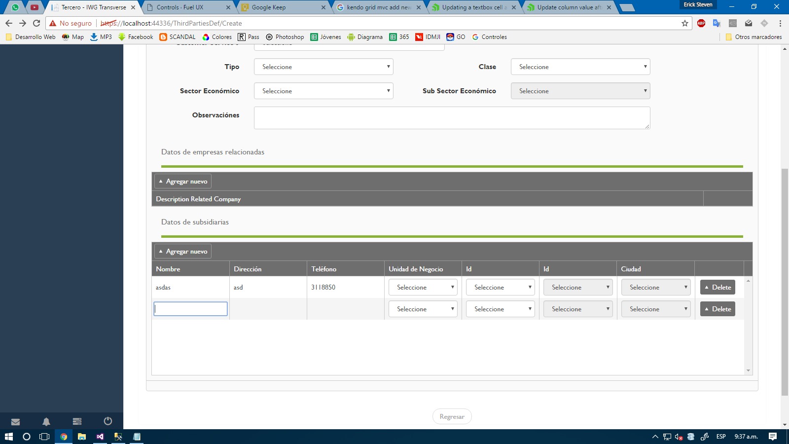 01.@(Html.Kendo().Grid(Model.Subsidiaries)02. .Name("Subsidiaries")03. .ToolBar(tools => tools.Create().Text("Agregar nuevo"))04. .Editable(editable => editable.Mode(GridEditMode.InCell).CreateAt(GridInsertRowPosition.Bottom))05. .Scrollable()06. .Columns(columns =>07. {08. columns.Bound(c => c.SubsidiariesName).ClientTemplate("#=SubsidiariesName #" +09. "<input type='hidden' name='Subsidiaries[#= indexSubsidiariesCommercial(data)#].SubsidiariesName' value='#= SubsidiariesName #' />"10. );11. columns.Bound(c => c.Address).ClientTemplate("#=Address #" +12. "<input type='hidden' name='Subsidiaries[#= indexSubsidiariesCommercial(data)#].Address' value='#= Address #' />"13. );14. columns.Bound(c => c.PhoneNumber).ClientTemplate("#=PhoneNumber #" +15. "<input type='hidden' name='Subsidiaries[#= indexSubsidiariesCommercial(data)#].PhoneNumber' value='#= PhoneNumber #' />"16. );17. columns.Bound(p => p.BusinessUnitsId).ClientTemplate(18. @Html.DropDownList("Subsidiaries[#= indexSubsidiariesCommercial(data)#].BusinessUnitsId", ViewBag.BusinessUnits as SelectList, "Seleccione",19. htmlAttributes: new { @class = "form-control" }).ToHtmlString()20. );21. columns.Bound(p => p.Id).ClientTemplate(22. @Html.DropDownList("Subsidiaries[#= indexSubsidiariesCommercial(data)#].Countries", ViewBag.Countries as SelectList, "Seleccione",23. htmlAttributes: new { @class = "form-control", @onchange = "changeCountry(this.value, #= indexSubsidiariesCommercial(data)#)" }).ToHtmlString()24. );25. columns.Bound(p => p.Id).ClientTemplate(26. @Html.DropDownList("Subsidiaries[#= indexSubsidiariesCommercial(data)#].Departments", ViewBag.Departments as SelectList, "Seleccione",27. htmlAttributes: new { @class = "form-control", @disabled = "disabled", @onchange = "changeDepartment(this.value, #= indexSubsidiariesCommercial(data)#)"28. }).ToHtmlString()29. );30. columns.Bound(p => p.CitiesId).ClientTemplate(31. @Html.DropDownList("Subsidiaries[#= indexSubsidiariesCommercial(data)#].CitiesId", ViewBag.Cities as SelectList, "Seleccione",32. htmlAttributes: new { @class = "form-control", @disabled = "disabled" }).ToHtmlString()33. );34. columns.Bound(c => c.SourceCreated).ClientTemplate("#=SourceCreated #" +35. "<input type='hidden' name='Subsidiaries[#= indexSubsidiariesCommercial(data)#].SourceCreated' value='#= SourceCreated #' />"36. ).Hidden(true);37. columns.Bound(c => c.UserCreated).ClientTemplate("#=UserCreated #" +38. "<input type='hidden' name='Subsidiaries[#= indexSubsidiariesCommercial(data)#].UserCreated' value='#= UserCreated #' />"39. ).Hidden(true);40. columns.Command(command => command.Destroy()).Width(100);41. })42. .DataSource(dataSource => dataSource43. .Ajax()44. .ServerOperation(false)45. .Model(model =>46. {47. model.Id(s => s.Id);48. model.Field(p => p.UserCreated).DefaultValue(HttpContext.Current.GetOwinContext().49. Authentication.User.Claims.First(x => x.Type == System.IdentityModel.Claims.ClaimTypes.GivenName).Value);50. model.Field(p => p.SourceCreated).DefaultValue(HttpContext.Current.Request.RequestContext.RouteData.Values["controller"].ToString()51. + "/" + HttpContext.Current.Request.RequestContext.RouteData.Values["action"].ToString());52. })53. )54.)