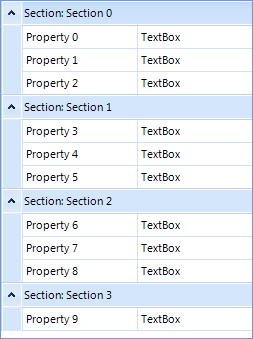 public Form1(){ InitializeComponent(); radGridView1.ShowColumnHeaders = false; radGridView1.ShowGroupPanel = false; radGridView1.ShowRowHeaderColumn = false; radGridView1.AllowAddNewRow = false; radGridView1.AutoSizeColumnsMode = Telerik.WinControls.UI.GridViewAutoSizeColumnsMode.Fill; radGridView1.GroupDescriptors.Add(new Telerik.WinControls.Data.GroupDescriptor("Section")); radGridView1.DataSource = GetTable();}static DataTable GetTable(){ DataTable table = new DataTable(); table.Columns.Add("Property", typeof(string)); table.Columns.Add("Property Value", typeof(string)); table.Columns.Add("Section", typeof(string)); for (int i = 0; i < 10; i++) { table.Rows.Add("Property " + i, "TextBox", "Section " + (i / 3)); } return table;}I hope this will be useful.