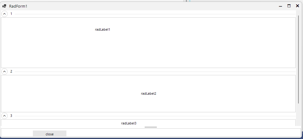 - Start adding RadCollapsiblePanels as you started. Let's say you add 1,2,3 panels.