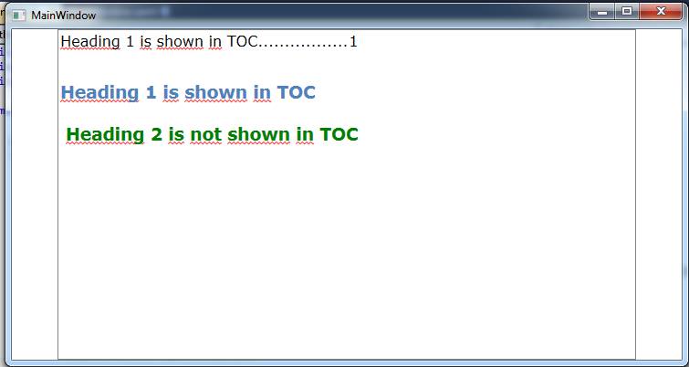 using System.Windows.Media;using Telerik.Windows.Documents.Model;using Telerik.Windows.Documents.Model.Styles;namespace RadRichtTextBoxTOCTest{ public partial class MainWindow { public MainWindow() { InitializeComponent(); var document = new RadDocument(); var section = new Section(); var paragraph1 = new Paragraph { StyleName = RadDocumentDefaultStyles.GetHeadingStyleNameByIndex(1) }; paragraph1.Inlines.Add(new Span("Heading 1 is shown in TOC")); section.Blocks.Add(paragraph1); var paragraph2 = new Paragraph { Style = GetHeadingStyle() }; paragraph2.Inlines.Add(new Span("Heading 2 is not shown in TOC")); section.Blocks.Add(paragraph2); document.Sections.Add(section); RichTextBox.Document = document; var toc = new TableOfContentsField(); RichTextBox.InsertField(toc, FieldDisplayMode.Result); toc.Update(); } private static StyleDefinition GetHeadingStyle() { return new StyleDefinition { DisplayName = "Test Heading 1", Name = "Test Heading 1", Type = StyleType.Paragraph, BasedOnName = RadDocumentDefaultStyles.GetHeadingStyleNameByIndex(1), ParagraphProperties = { LeftIndent = 6, SpacingBefore = 20, SpacingAfter = 0, }, SpanProperties = { //FontFamily = new FontFamily("Cambria"), ForeColor = Colors.Green, //FontWeight = fontWeight, //FontSize = fontSize, //FontStyle = fontStyle }, }; } }}0