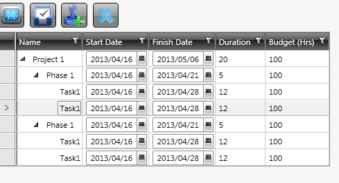 <telerik:RadTreeListView Grid.Row="2" VerticalAlignment="Top" HorizontalAlignment="Left" Margin="6,0,0,0" AutoGenerateColumns="True" ItemsSource="{Binding Project, Mode=TwoWay}" SelectedItem="{Binding Item}"> <telerik:RadTreeListView.ChildTableDefinitions> <telerik:TreeListViewTableDefinition ItemsSource="{Binding Phases}"/> <telerik:TreeListViewTableDefinition ItemsSource="{Binding Tasks}"/> </telerik:RadTreeListView.ChildTableDefinitions> <telerik:RadTreeListView.Columns> <telerik:GridViewDataColumn DataMemberBinding="{Binding Name}" Header="Name" /> <telerik:GridViewDataColumn Header="Start Date" DataType="{x:Type System:DateTime}"> <telerik:GridViewDataColumn.CellTemplate> <DataTemplate> <telerik:RadDatePicker SelectedValue="{Binding StartDate, Mode=TwoWay}" /> </DataTemplate> </telerik:GridViewDataColumn.CellTemplate> </telerik:GridViewDataColumn> <telerik:GridViewDataColumn Header="Finish Date" DataType="{x:Type System:DateTime}"> <telerik:GridViewDataColumn.CellTemplate> <DataTemplate> <telerik:RadDatePicker SelectedValue="{Binding FinishDate, Mode=TwoWay}" /> </DataTemplate> </telerik:GridViewDataColumn.CellTemplate> </telerik:GridViewDataColumn> <telerik:GridViewDataColumn Header="Duration" DataMemberBinding="{Binding Duration}" DataType="{x:Type System:Int32}" /> <telerik:GridViewDataColumn Header="Budget (Hrs)" DataMemberBinding="{Binding Budget}" DataType="{x:Type System:Double}" /> </telerik:RadTreeListView.Columns> </telerik:RadTreeListView>I've attached an image to show what the output is like.