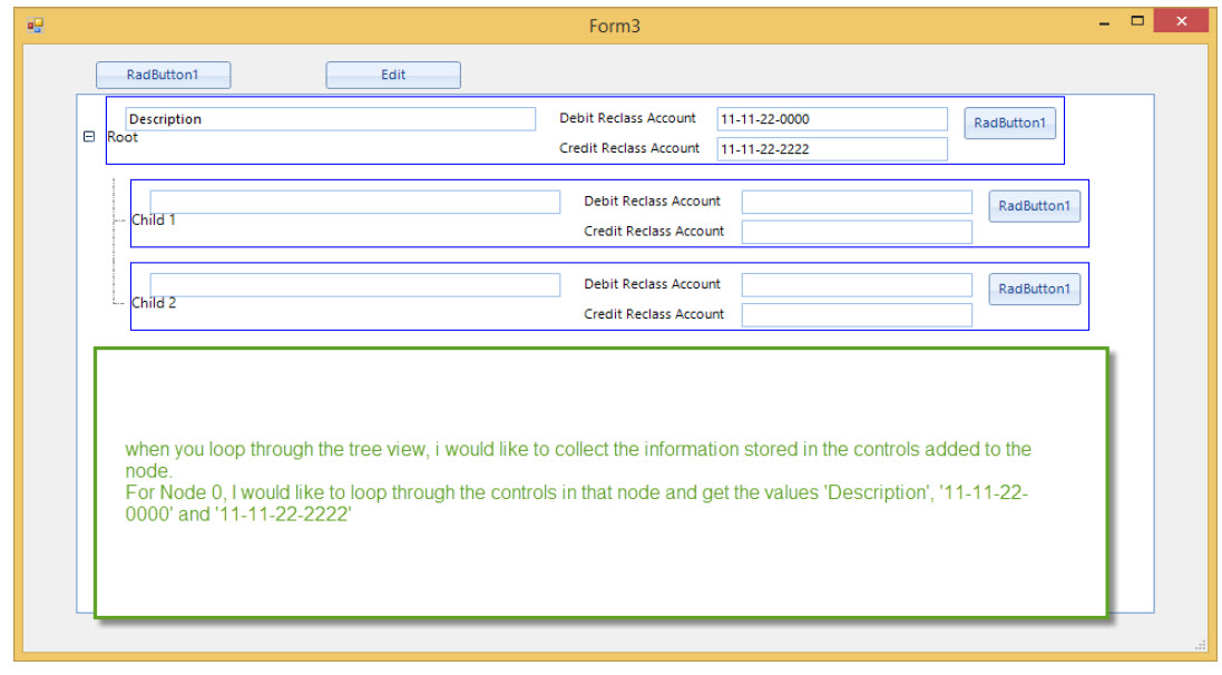 However, as my colleague, Stefan remarked, RadTreeView uses UI virtualization for its nodes. Hence, when you preform scrolling, the visual elements will be reused to display the information for the relevant RadTreeNodes. That is why I would recommend you to use the custom elements for updating the corresponding DataBoundItem. Afterwards, you can access the requested information by using the RadTreeNode.DataBoundItem property.