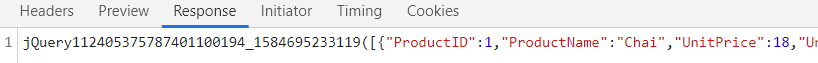 jQuery112409029558402791507_1584524506646([{"ProductID":1,"ProductName":"Chai","UnitPrice":18,"UnitsInStock":39,"Discontinued":false},{"ProductID":2,"ProductName":"Chang","UnitPrice":19,"UnitsInStock":17,"Discontinued":false},{"ProductID":3,"ProductName":"Aniseed Syrup","UnitPrice":10,"UnitsInStock":13,"Discontinued":false} ])Namely, the response must be wrapped in a jQuery object when using jsonp data type. If this type is omitted it will work as you can see in the following Dojo demo: