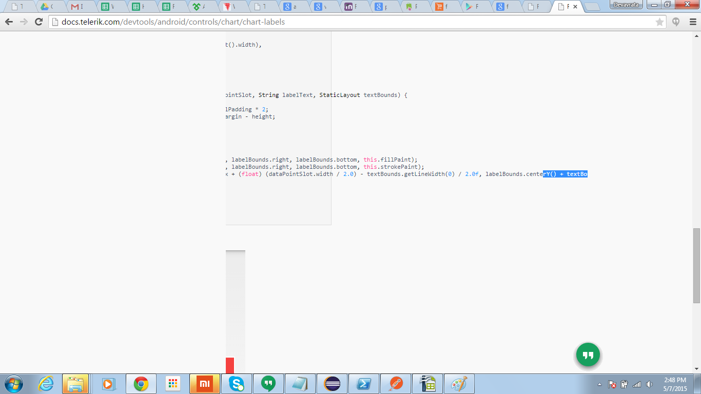 I will forward to code example issue in the help to our help team. Thanks for reporting that. I don't think you can do something to browser to fix that. I suggest copy/pasting the whole code block into Android Studio/Eclipse and inspecting the example there.