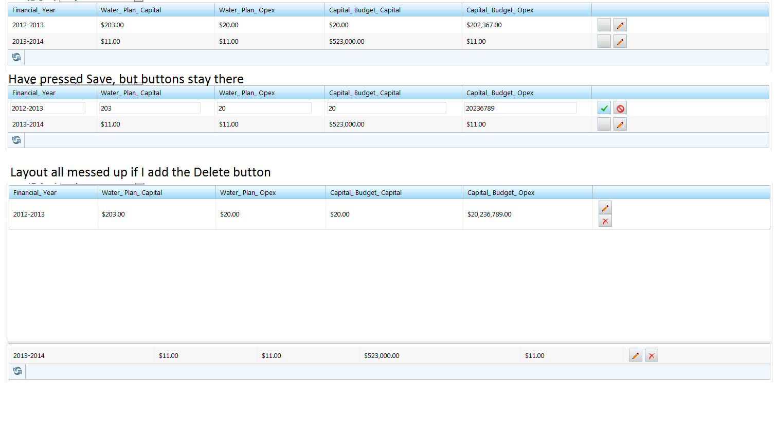 - If I add the Delete button the layout gets all messed up, the Select/Edit buttons if I display those no problem.