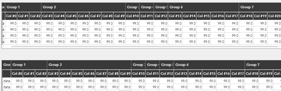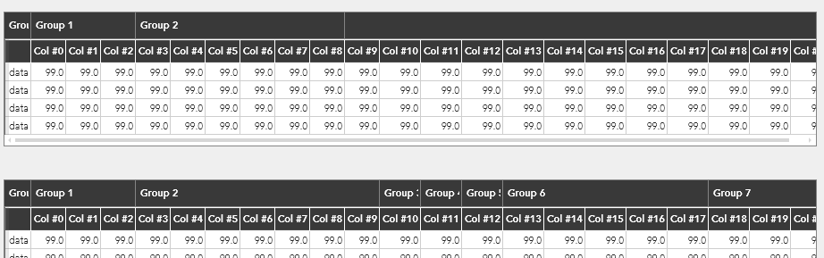 private void AddColum(ColumnData column){ if (column == null) { return; } // If the column group does not exist add it. if (!_columnGroupsAdded.Contains(column.GroupId)) { ResultsGridView.ColumnGroups.Add(CreateColumnGroup(column.GroupId, column.GroupHeader)); _columnGroupsAdded.Add(column.GroupId); } // If the column group does exist but is not the last group added // don't add the column as an exception is thrown. if (!_columnGroupsAdded.Last().Equals(column.GroupId)) { return; } ResultsGridView.Columns.Add(CreateColumn(column));}protected internal virtual GridViewColumnGroup CreateColumnGroup(string id, string header){ return new GridViewColumnGroup { Header = header, Name = id };}protected internal virtual GridViewDataColumn CreateColumn(ColumnData columnData){ if (columnData == null) { return null; } return new GridViewDataColumn { Header = columnData.ColumnHeader, DataMemberBinding = new Binding {Path = new PropertyPath("[" + columnData.ColumnId + "]")}, ColumnGroupName = columnData.GroupId };}I am using the same code to build multiple grids and the groups appear fine on the second grid, it is just the first one that there seems to be an issue. I have attached a screen shot of what the the grids look like when it is first drawn and what it looks like after it has been scrolled.