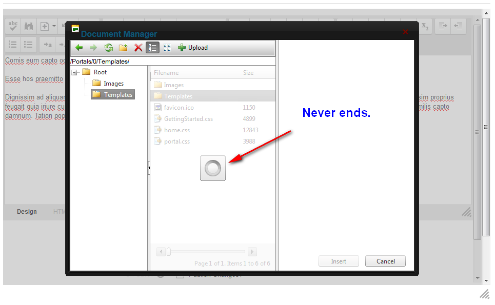 I am trying to add an image to content in ​RAD editor. I call the Image Manager window and when I click on the Images folder and Image Manager tries to parse the folder content the progress indicator displays inside the image list pane and never ends. I can access images stored in the root of the image folder location however if I need to navigate to a subfolder under the image folder root I experience the problem with accessing the content - Image Manager can never finish the job of reading the folder content and displaying it in the pane.