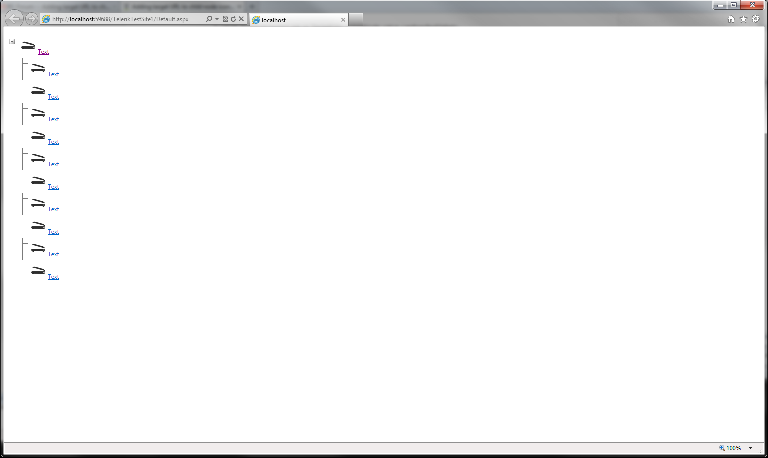 <telerik:RadTreeView ID="RadTreeView1" runat="server" OnNodeCreated="OnRadTreeNodeCreated"> <NodeTemplate> <asp:ImageButton ID="ImageButton2" runat="server" ImageUrl="~/Images/Scanner5 32x32.png" PostBackUrl="http://www.hotmail.com" /> <asp:HyperLink ID="HyperLink1" runat="server" NavigateUrl="http://www.bing.com">Text</asp:HyperLink> <%# DataBinder.Eval(Container, "Text") %> </NodeTemplate> </telerik:RadTreeView>But, I am actually looking for some kind of functionality where the link does not show "text" for ALL but we can actually set it dynamically per node