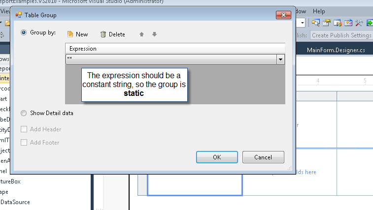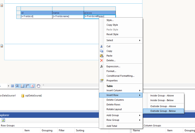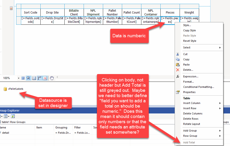 Then, inside the new row, add '= Sum(fields.Pieces)' as a value in the textbox where you want it to be. This should result in the same design as directly adding totals.