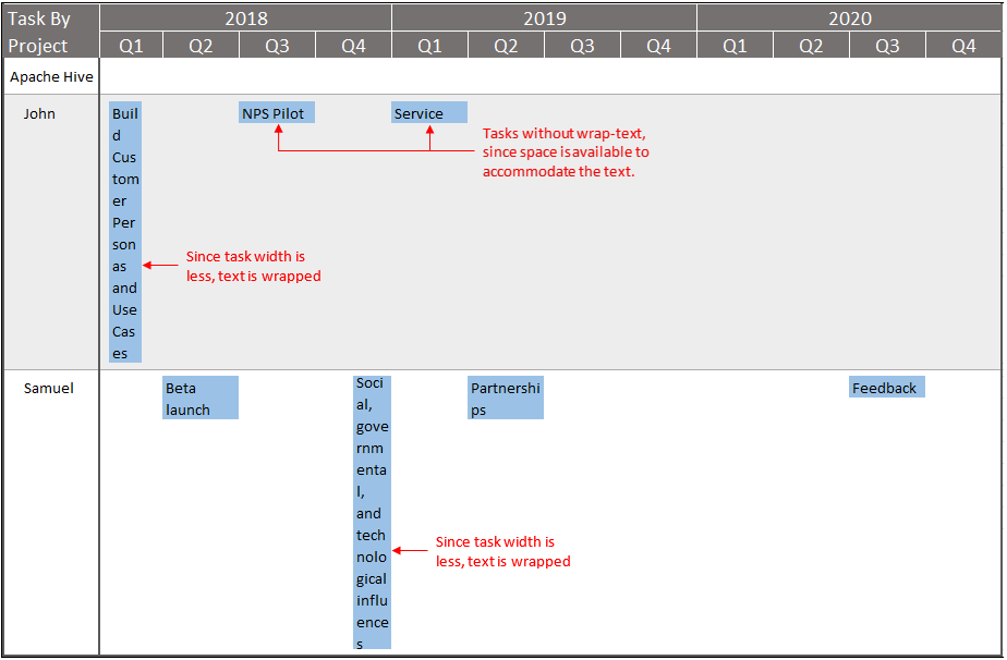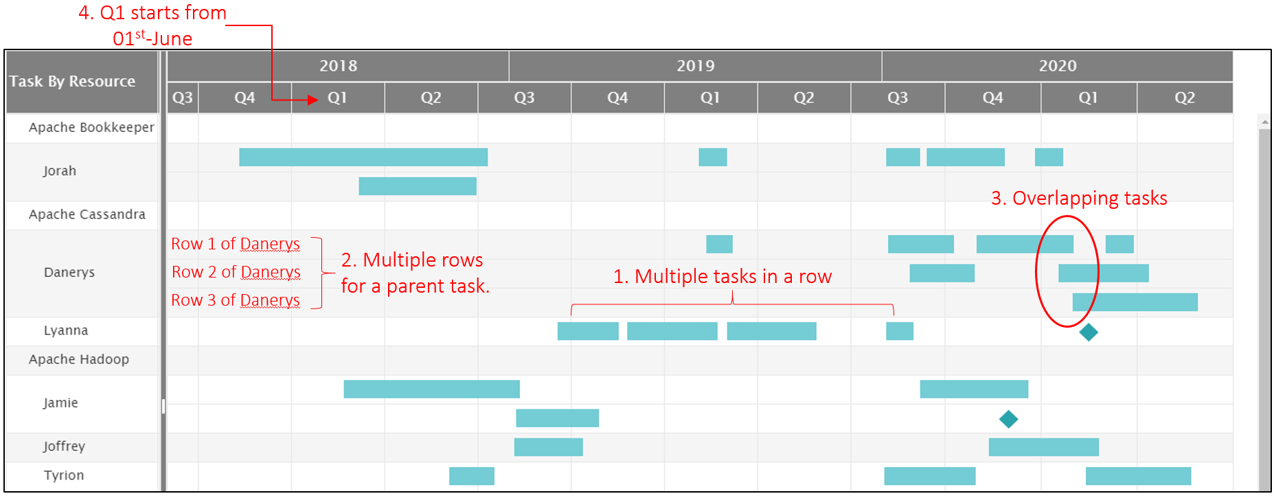 - If space is not available in preceding row(s), overlapping tasks should be moved to next row.