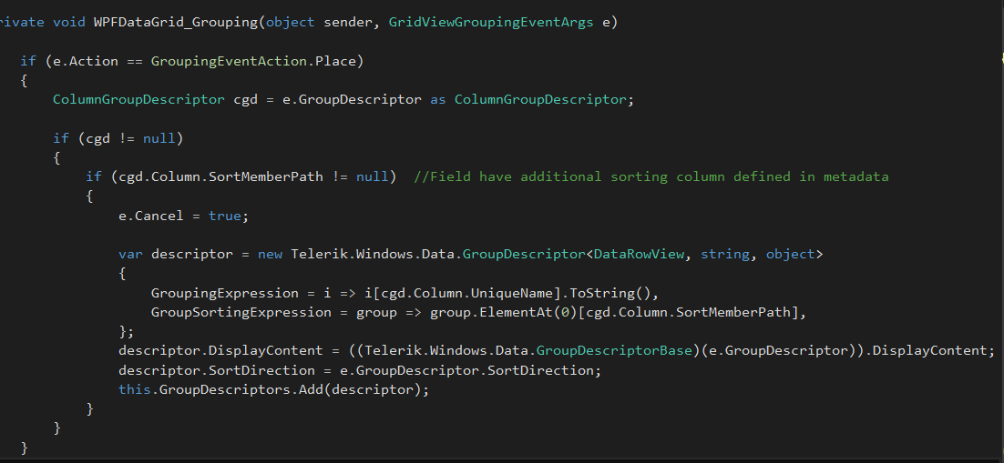 Hi, I would like to set column sorting based on other column from grid. Please look on attached picture (Table.png) where you can see simple definition (I have column "Desc1" and primary key "SecMainClass". For header on column "Desc1" I'm using resource "Main classification"). I want use sorting for column "Desc1" based on primary key "SecMainClass". I saw that I can use property "SortMemberPath" for additional sorting definition and that works fine if I don't have grouping. When I put column "Desc1" as grouped column, grid use default ("alphabetically") sorting. For grouping I'm using new "ColumnGroupDescriptor". Before I decide ask you, I saw that I can use custom group descriptor....Please look attached picture (CustomGrouping.png). As you can see I was create custom grouping descriptor and sorting works fine on grouping too but in that case grid doesn't show totals on grouping header for other columns....(picutre "TotalsON" is with normal GroupColumnDescriptor where totals are showed and picture "TotalsOFF" is with custom grouping descriptor where totals missing). My question is: How I can use custom sorting on ColumnGroupDescriptor? Can you help me and tell me it is possible to apply "GroupSortingExpression" from "custom grouping descriptor" to "ColumnGroupDescriptor" with method "CreateGroupSortExpression"? Can you send me example how I can use that method because I didn't find any example on your documentation or foru?. Do you have maybe any other solution for situation like this? My version is : 2016.2.613.45. Thank you very much for your help. I'm looking forward to hearing from you.