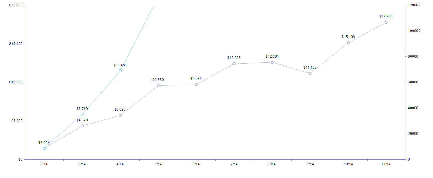 Dim lineMonthlyProfits As New LineSeriesDim lineTotalProfits As New LineSeriesDim yAxisTotalProfits As New AxisYDo While ChartingMonth < Now() GrossProfit = 0 : Fees = 0 'Code here that pulls values from db TotalProfit += GrossProfit - Fees lineMonthlyProfits.SeriesItems.Add(CInt(GrossProfit - Fees)) lineTotalProfits.SeriesItems.Add(Int(TotalProfit)) chartMonthlyProfits.PlotArea.XAxis.Items.Add(CStr(Month(ChartingMonth)) & "/" & Right(CStr(Year(ChartingMonth)), 2)) ChartingMonth = DateAdd(DateInterval.Month, 1, ChartingMonth)LooplineMonthlyProfits.Name = "Monthly Profit"lineMonthlyProfits.LabelsAppearance.DataFormatString = "{0:c0}"lineTotalProfits.LabelsAppearance.DataFormatString = "{0:c0}"chartMonthlyProfits.PlotArea.Series.Add(lineMonthlyProfits)chartMonthlyProfits.PlotArea.YAxis.MaxValue = 20000 'Not needed but in place for testing purposesyAxisTotalProfits.Name = "Total Profits"chartMonthlyProfits.PlotArea.AdditionalYAxes.Add(yAxisTotalProfits)chartMonthlyProfits.PlotArea.XAxis.AxisCrossingPoints.Add(0)chartMonthlyProfits.PlotArea.XAxis.AxisCrossingPoints.Add(lineTotalProfits.SeriesItems.Count)lineTotalProfits.Name = yAxisTotalProfits.NamechartMonthlyProfits.PlotArea.Series.Add(lineTotalProfits)chartMonthlyProfits.PlotArea.YAxis.LabelsAppearance.DataFormatString = "{0:c0}"chartMonthlyProfits.PlotArea.YAxis.MinorGridLines.Visible = FalsechartMonthlyProfits.PlotArea.XAxis.MinorGridLines.Visible = FalsechartMonthlyProfits.PlotArea.XAxis.MajorGridLines.Visible = FalsechartMonthlyProfits.Legend.Appearance.Visible = False