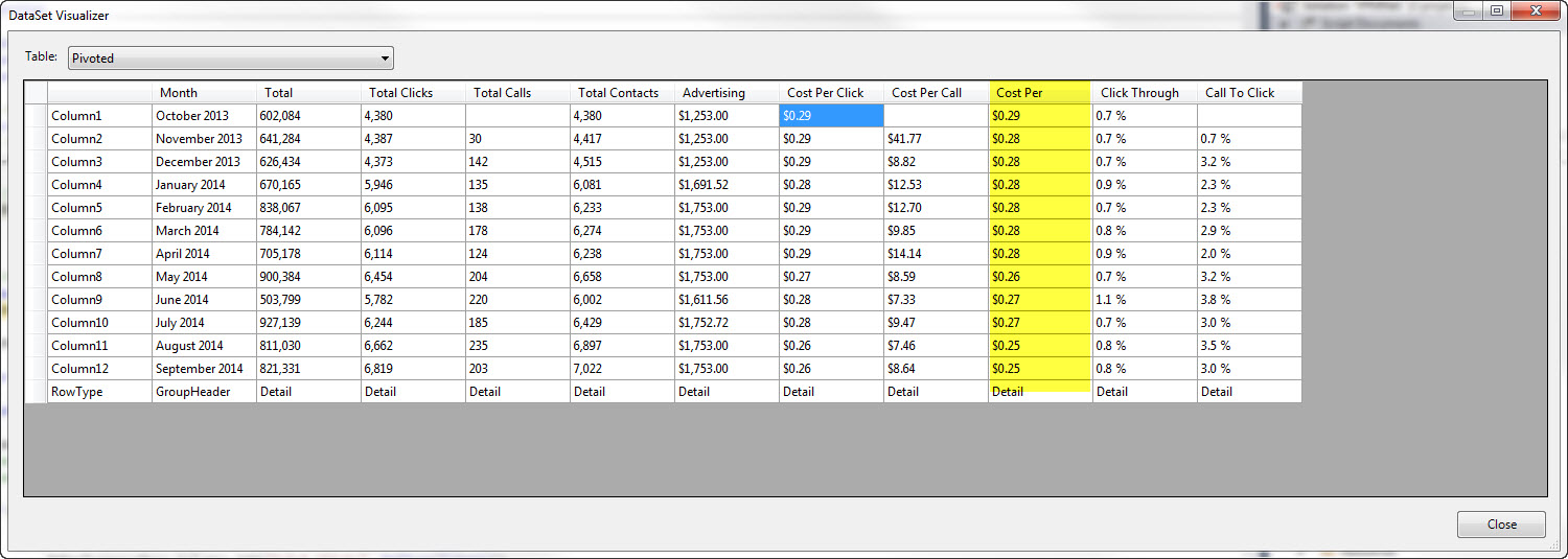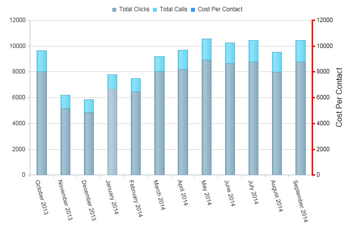 <telerik:RadHtmlChart runat="server" Width="700px" Height="500px" ID="DashboardMonthlyChart" Skin="Vista"> <PlotArea> <Series> <telerik:ColumnSeries DataFieldY="TotalClicks" Name="Total Clicks" Stacked="True"> <LabelsAppearance Visible="false"></LabelsAppearance> <TooltipsAppearance Color="White" /> </telerik:ColumnSeries> <telerik:ColumnSeries DataFieldY="TotalCalls" Name="Total Calls"> <LabelsAppearance Visible="false"></LabelsAppearance> <TooltipsAppearance Color="White" /> </telerik:ColumnSeries> <telerik:LineSeries AxisName="AdditionalAxis" Name="Cost Per Contact"> <LabelsAppearance Visible="false"></LabelsAppearance> <TooltipsAppearance Color="White" /> </telerik:LineSeries> </Series> <XAxis DataLabelsField="Month"> <LabelsAppearance RotationAngle="75" Step="1"> </LabelsAppearance> <TitleAppearance Text=""> </TitleAppearance> <AxisCrossingPoints> <telerik:AxisCrossingPoint Value = "0" /> <telerik:AxisCrossingPoint Value = "12" /> </AxisCrossingPoints> </XAxis> <YAxis> <TitleAppearance Text=""> </TitleAppearance> </YAxis> <AdditionalYAxes> <telerik:AxisY Name="AdditionalAxis" Color="Red" Width="3"> <TitleAppearance Text = "Cost Per Contact"> <TextStyle Color="Black" /> </TitleAppearance> <LabelsAppearance> <TextStyle Color="Black" /> </LabelsAppearance> </telerik:AxisY> </AdditionalYAxes> </PlotArea> <Legend> <Appearance Visible="true" Position="Top"> </Appearance> </Legend> </telerik:RadHtmlChart>Private Sub LoadDashboardDetails() Dim dtPerformance As DataTable Dim IYPPerformanceInfo As XElement = Nothing '//Rerence WCF service. Dim oypmservice As New CL_ADOMDService.WCFAdomdServiceClient '//Data returned as XElement IYPPerformanceInfo = oypmservice.GetIYPDashboardByMonth(Session("AcctNum"), ViewState("PubInitID"), ViewState("StartDate"), ViewState("EndDate"), True) ''//Convert XElement to Datatable dtPerformance = clMisc.GetDataTableFromXMLElement(IYPPerformanceInfo) '//Store data in Session Dim dtPerformanceRows As DataTable dtPerformanceRows = dtPerformance.Select("Month<>'GroupHeader'").CopyToDataTable dtPerformanceRows.Columns.Add(New DataColumn("MonthNumber", GetType(Date))) For Each dr In dtPerformanceRows.Rows dr("MonthNumber") = CDate(dr("Month")) 'Split(dr("Month").ToString.Trim, " ")(0) Next ViewState("IYPDashboard") = dtPerformanceRows 'testgrid.DataSource = dtPerformanceRows 'testgrid.DataBind() If dtPerformance IsNot Nothing Then If dtPerformanceRows.Columns.Contains("Total Clicks") = False Then dtPerformanceRows.Columns.Add("Total Clicks", GetType(Integer)) End If If dtPerformanceRows.Columns.Contains("Total Calls") = False Then dtPerformanceRows.Columns.Add("Total Calls", GetType(Integer)) End If If dtPerformanceRows.Columns.Contains("Cost Per Contact") = False Then dtPerformanceRows.Columns.Add("Cost Per Contact", GetType(Double)) End If LoadDetailChart() DashboardDetailsListView.DataSource = dtPerformanceRows.Select("", "MonthNumber Asc").CopyToDataTable DashboardDetailsListView.DataBind() End If DashboardMonthlyChart.ChartTitle.Text = ViewState("PubName") DashboardMonthlyChart.PlotArea.XAxis.AxisCrossingPoints(1).Value = Decimal.Parse(12) DashboardMonthlyChart.ChartTitle.Appearance.TextStyle.Bold = True DashboardMonthlyChart.ChartTitle.Appearance.Align = Telerik.Web.UI.HtmlChart.ChartTitleAlign.Left DashboardMonthlyChart.Legend.Appearance.TextStyle.Margin = "8" DashboardMonthlyChart.PlotArea.XAxis.MajorGridLines.Visible = False DashboardMonthlyChart.PlotArea.XAxis.MinorGridLines.Visible = False DashboardMonthlyChart.PlotArea.YAxis.MajorGridLines.Visible = True DashboardMonthlyChart.PlotArea.YAxis.MinorGridLines.Visible = False End Sub Private Sub LoadDetailChart() Dim dtMonthlyDetail As DataTable dtMonthlyDetail = ViewState("IYPDashboard") Dim dtChartData As DataTable Dim ColumnNames() As String Dim dc As DataColumn ColumnNames = "Month,Total Clicks,Total Calls,Total Contacts,Cost Per Contact,MonthNumber".Split(",") Dim view As DataView view = New DataView(dtMonthlyDetail) dtChartData = view.ToTable(True, ColumnNames).Select("", "MonthNumber Asc").CopyToDataTable For Each dc In dtChartData.Columns dc.ColumnName = dc.ColumnName.Replace(" ", "") Next DashboardMonthlyChart.DataSource = dtChartData DashboardMonthlyChart.DataBind() End Sub