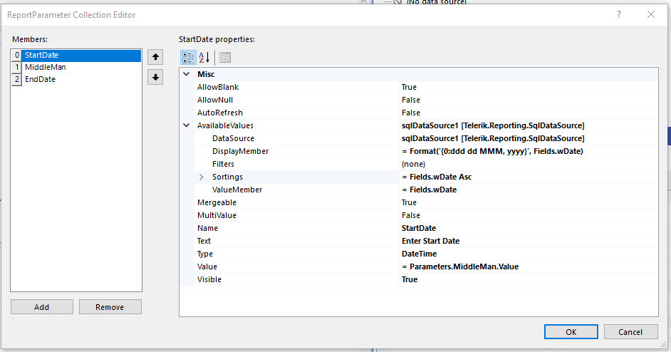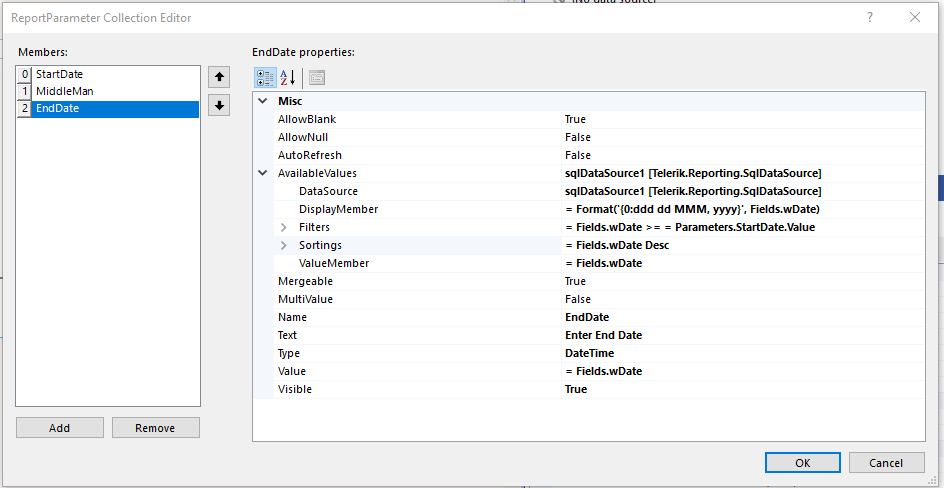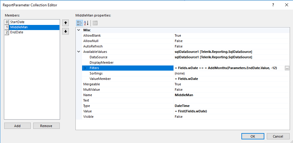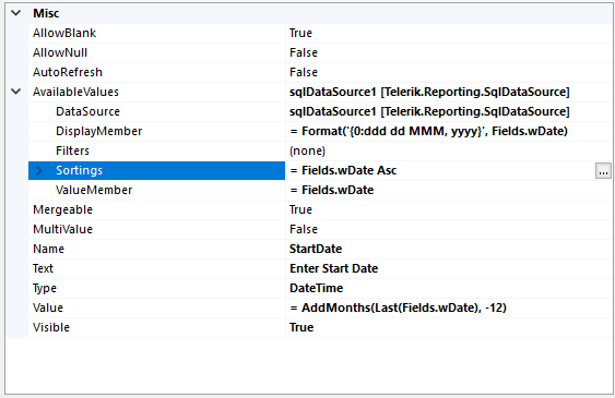 = AddMonths(Last(Fields.wDate), -12)The above displays the past 12 months of data on a graph which has 5 years (60 months) of data.
