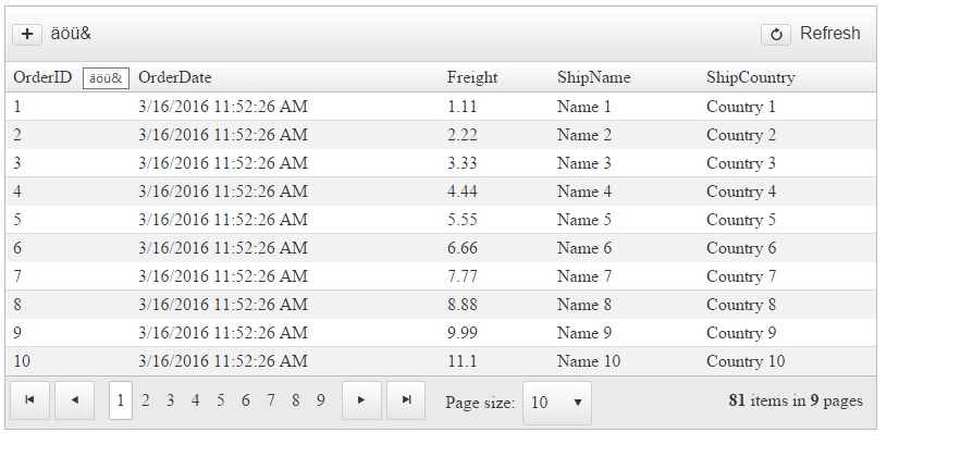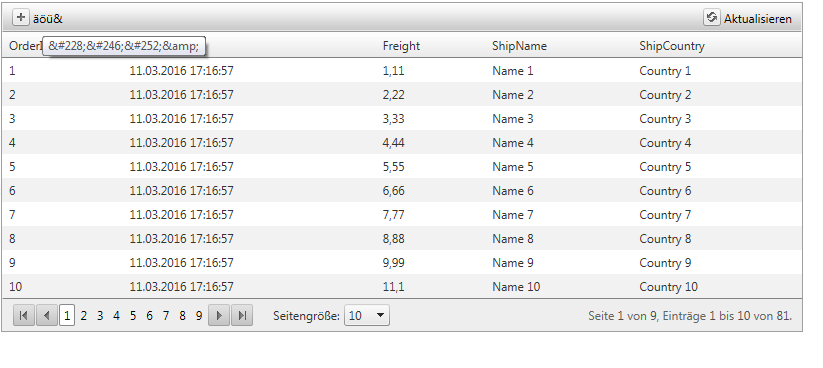 If I add a value of "äöü&" to the AddNewRecordText of the CommandItemSettings for example, the button text appears correctly but the tooltip is displayed wrong. It shows "äöü&". It doesn't help when I put the already encoded text into the AddNewRecordText.
