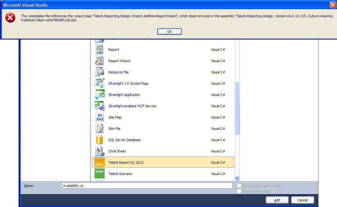 The vstemplate file references the wizard class 'Telerik.Reporting.Design.Wizard.AddNewReportWizard', which does not exist in the assembly 'Telerik.Reporting.Design', Version=6.0.12.215, Culture=neutral, PublickeyToken=a9d783dfcc261be'