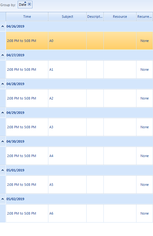 this.radScheduler1.ActiveViewType = SchedulerViewType.Agenda;SchedulerAgendaViewElement agendaViewElement = this.radScheduler1.SchedulerElement.ViewElement as SchedulerAgendaViewElement;RadGridView agendaGrid = agendaViewElement.Grid;agendaGrid.TableElement.RowHeight = 60;I hope this information helps. If you need any further assistance please don't hesitate to contact me.
